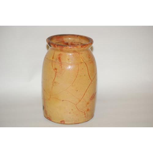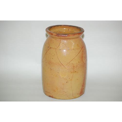 NEW ENGLAND REDWARE STORAGE JAR - 10" NEW ENGLAND REDWARE STORAGE JAR W/ FLANGED BRIM & RED & PUTTY COLORED GLAZE (PROBABLY ME)(10" T X 7" DIA.) - NO LID, RIM CHIPS, WEAR, IMPERFECTIONS