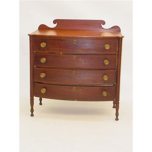 NEW ENGLAND SHERATON BOWFRONT CHEST - 4 DRAWER MAHOGANY CHEST W/ SHAPED BACKSPLASH, RING TURNED POSTS, COOKIE CORNERS & BRASS ROSETTE HARDWARE (43 1/4" T X 40" W X 20" D) - WEAR, REPLACEMENT BACKSPLASH, IMPERFECTIONS;