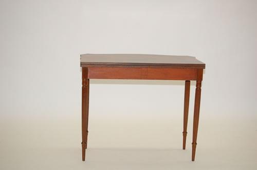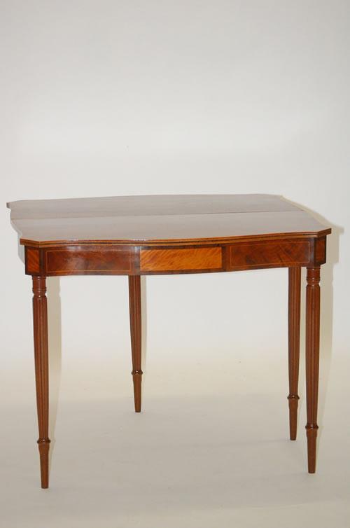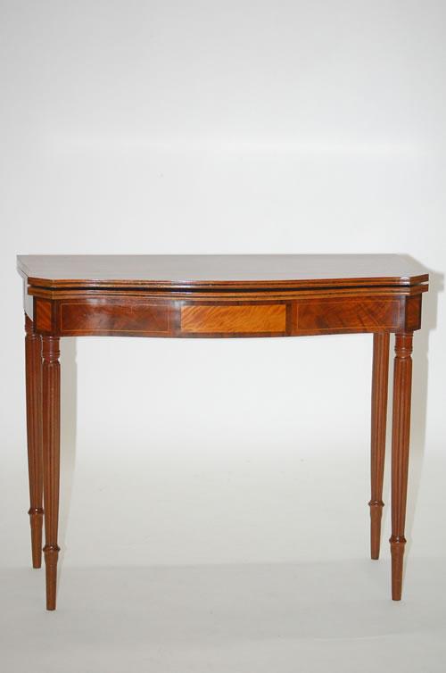 NEW ENGLAND SHERATON CARD TABLE - INLAID MAHOGANY SHAPED FLIP TOP GAMING TABLE W/ SHAPED FRIEZE W/ LINE, BAND & PANEL INLAY & REEDED TAPERED LEGS (29 3/4" T X 35 1/2" W X 18" D) - WEAR, REPAIRS, REPLACEMENTS, IMPERFECTIONS
