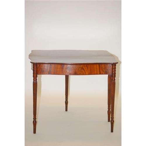 NEW ENGLAND SHERATON CARD TABLE - MA MAHOGANY NORTH SHORE FOLDING GAME TABLE W/ SHAPED TOP, BOWED & SHAPED FRIEZE W/ DELICATE RING TURNED & REEDED LEGS (29 1/2"T X 36 1/2"W X 18 1/2"D) - WEAR, REPAIRS, IMPERFECTIONS