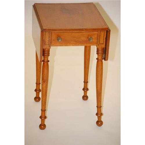NEW ENGLAND SHERATON INLAID DROPLEAF STAND-WALNUT 1 DRAWER DROPLEAF STAND W/ DIVIDED DRAWER, SHAPED DROP LEAVES & TURNED TAPERED LEGS W/ CHECKERED & SPIDER WEB INLAY (FROM VT)(29.75"T X 18.25"W X 21.5"D)-WEAR, REPAIRS, REPLACEMENTS, MODIFICATIONS