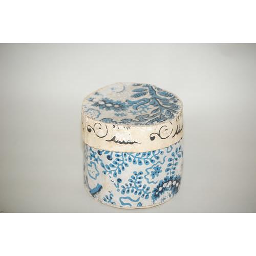 NEW ENGLAND WALLPAPER BAND BOX - MINI 19TH CENT. ROUND CANISTER WALLPAPER COVERED PAPIER MACHE BAND BOX W/ BLUE & WHITE WALLPAPER COVERING & 1852 NEWSPAPER LINING W/ SOUTHEAST U.S. MAP(4 3/8"T X 4 5/8"W)-EDGE WEAR, SM. LOSSES, CRACKS, IMPERFECTIONS
