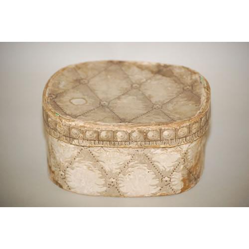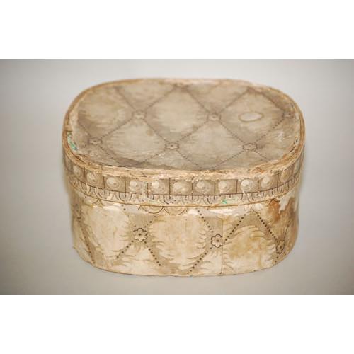 NEW ENGLAND WALLPAPER BAND BOX - MINIATURE 19TH CENT. OVAL HAND SEWN PAPIER MACHE BAND BOX W/ 2 LAYERS OF FLORAL WALLPAPER COVERING (3 1/4" T X 6 1/2" L X 5 1/4" W) - EDGE WEAR, STAIN, SMALL LOSSES, IMPERFECTIONS