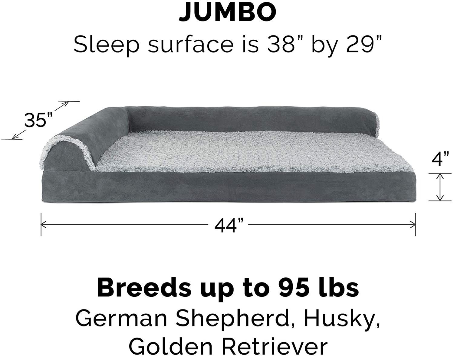 JUMBO PET BED WITH RAISED 2 SIDED PILLOW TOP CUSHIONING, VELVET FAUX FUR PLUSH TOP, GREY, REMOVEABLE COVER, 35 X 44", AMZ SES