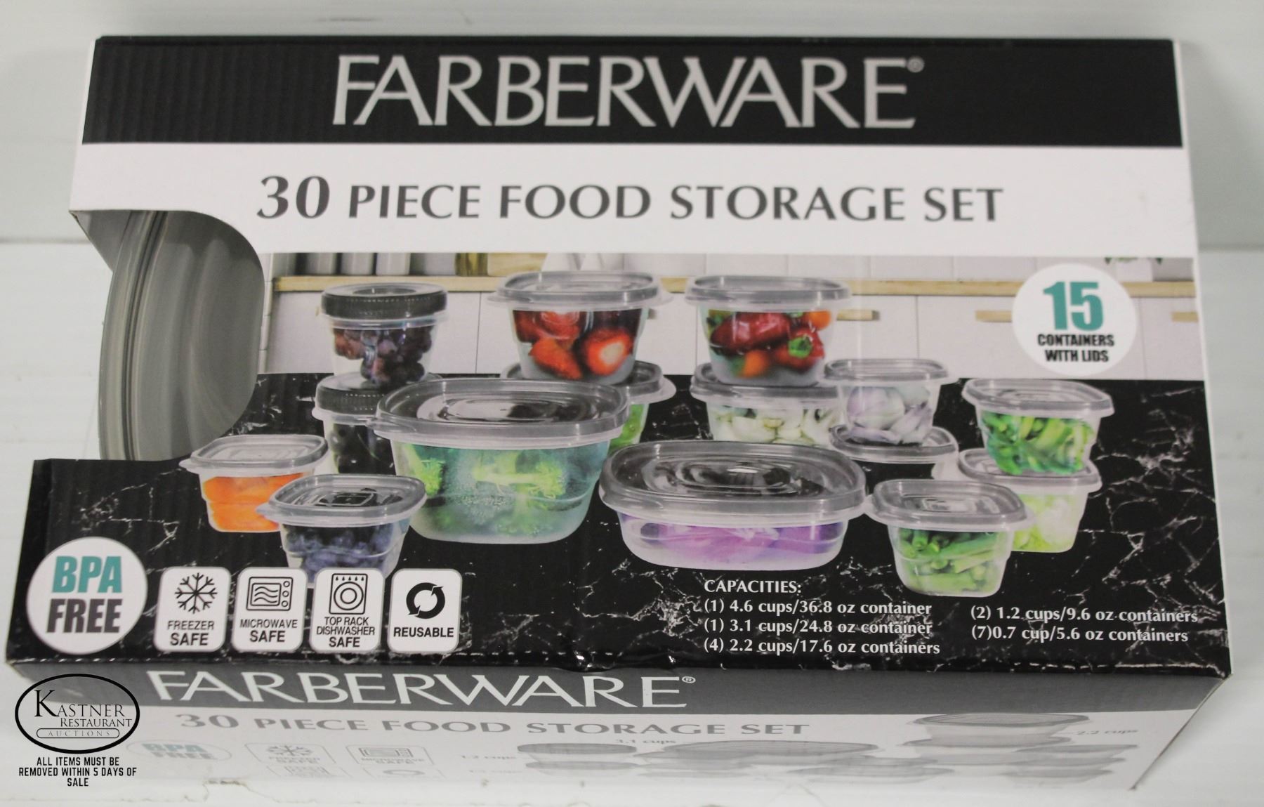 15 CONTAINERS W/ LIDS. CONTAINER SIZES INCLUDE: (1) 4.6 CUP, (1) 3.1 CUP, (4) 2.2 CUP, (2) 1.2 CUP, & (7) 0.7 CUP **ALL ITEMS MUST BE REMOVED BY 5PM MONDAY, FEBRUARY 6TH, 2023. ALL REMAINING ITEMS WILL BE SUBJECT TO A $6.00 PER DAY STORAGE CHARGE. ANY ITEMS REMAINING AFTER MONDAY, FEBRUARY 20TH, 2023 WILL BE CONSIDERED FORFEITED. NO REFUNDS WILL BE ISSUED FOR FORFEITED ITEMS.** TO SCHEDULE A PICK UP APPOINTMENT CLICK HERE