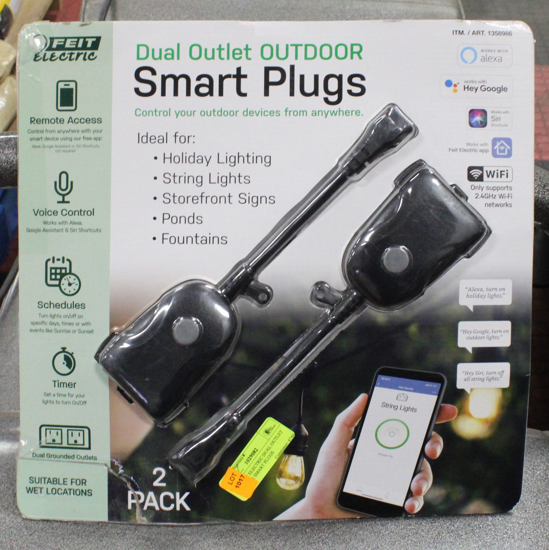 CONNECTED TO WIFI. ACCESSIBLE FROM APP ON PHONE. IDEAL FOR HOLIDAY LIGHTING, STRING LIGHTS, ETC. WORKS WITH ALEXA, GOOGLE, & SIRI
