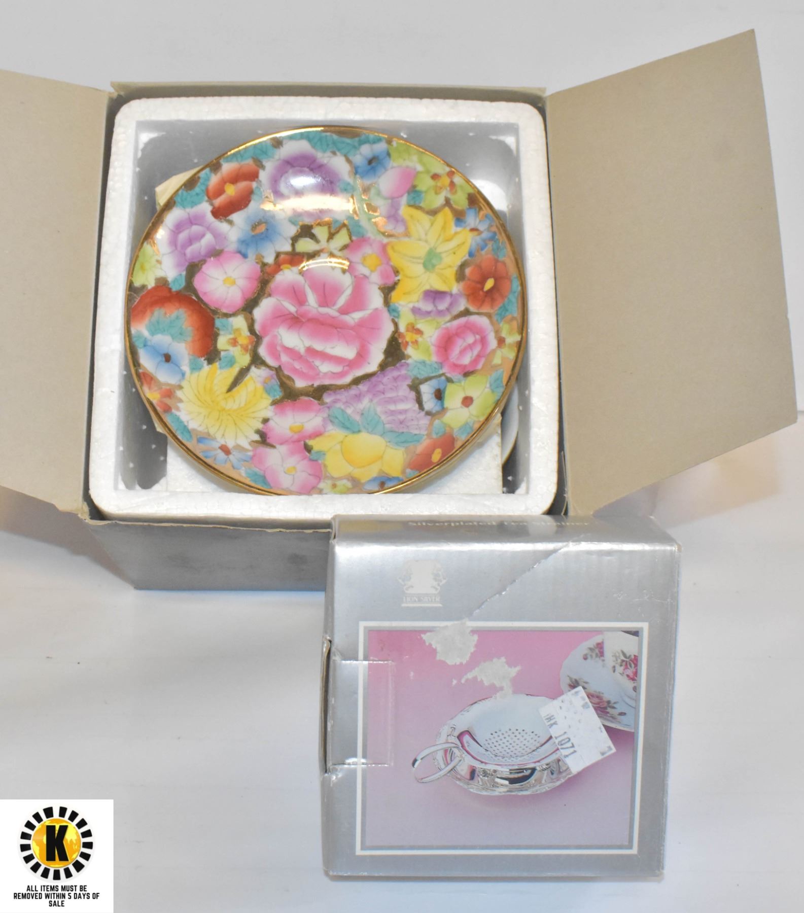 TEA STRAINER NEW IN BOX, HAND MADE CUP AND SAUCER SETS AND NEW SILVER TEA STRAINER