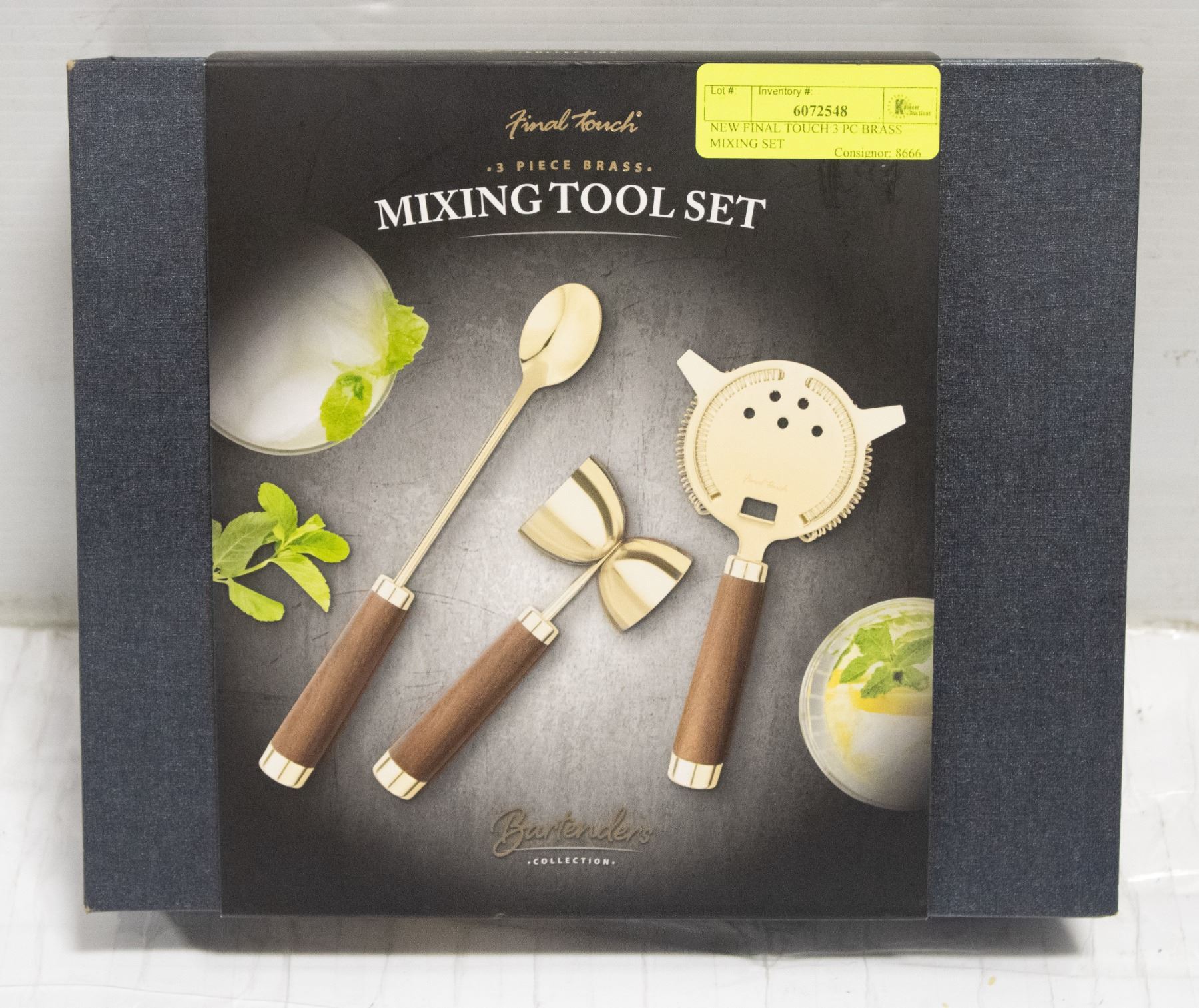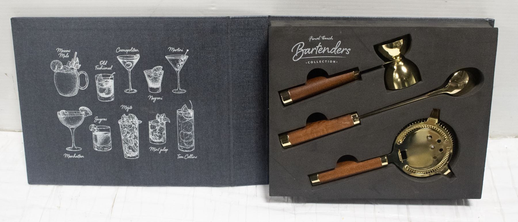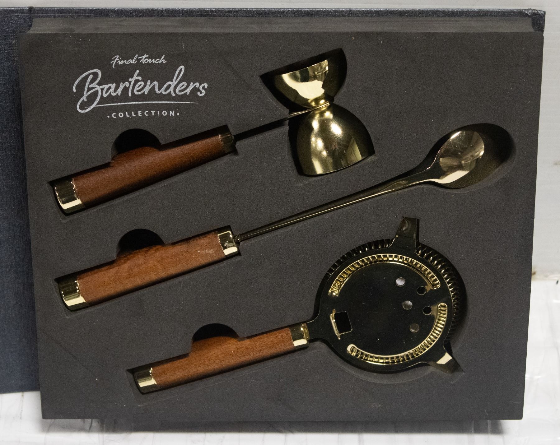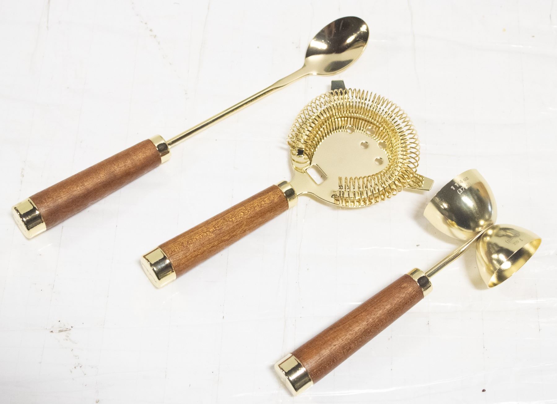 BARTENDERS COLLECTION, COMES W/ DOUBLE SIDED JIGGER 1 OZ & 2 OZ, STRAINER, & 10.7" SPOON. FEATURES SOLID WOOD HANDLES, STAINLESS STEEL W/ BRASS PLATING, REMOVABLE STAINER SPRING FOR EASY CLEANING