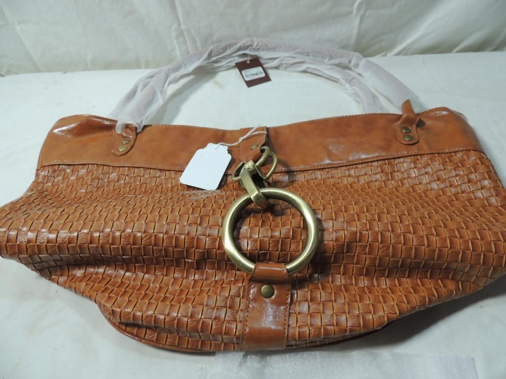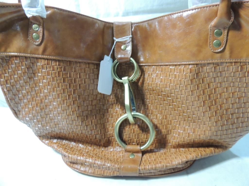 BROWN WEAVED LEATHER FOREVER 21 PURSE. GOLDTONE BUCKLE. AS SHOWN. SEE PHOTO FOR MORE DETAILS.