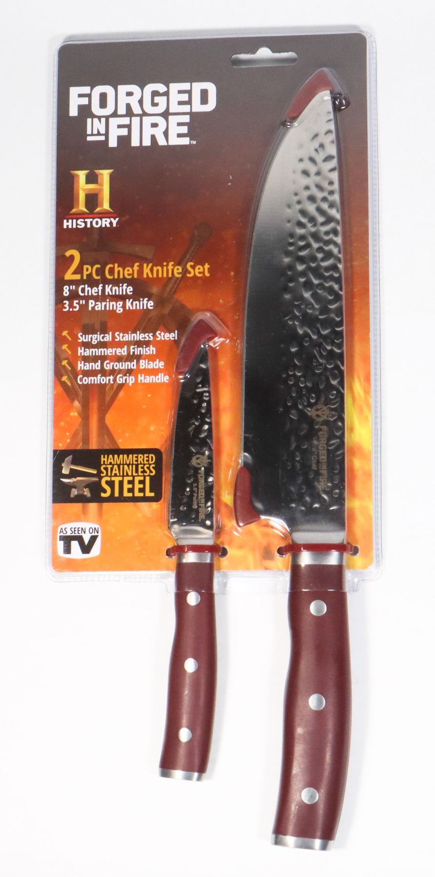 8" CHEF KNIFE, 3.5" PARING KNIFE. SURGICAL STAINLESS STEEL, HAMMERED FINISH, HAND GROUND BLADE, COMFORT GRIP HANDLE
