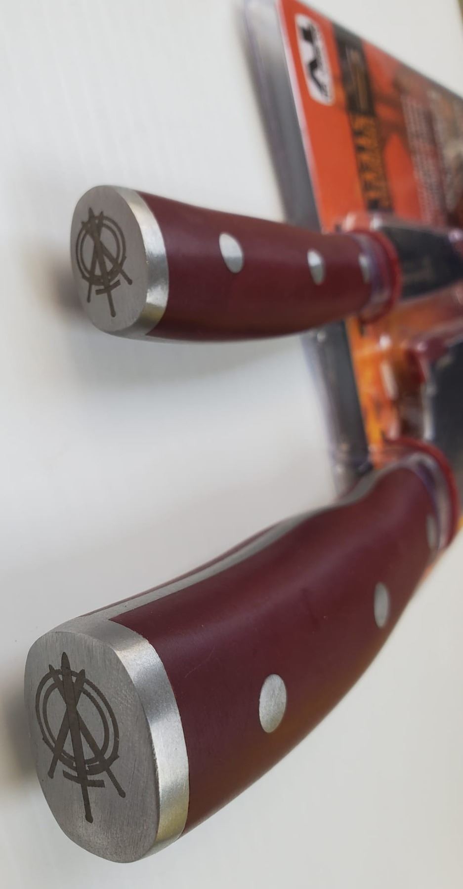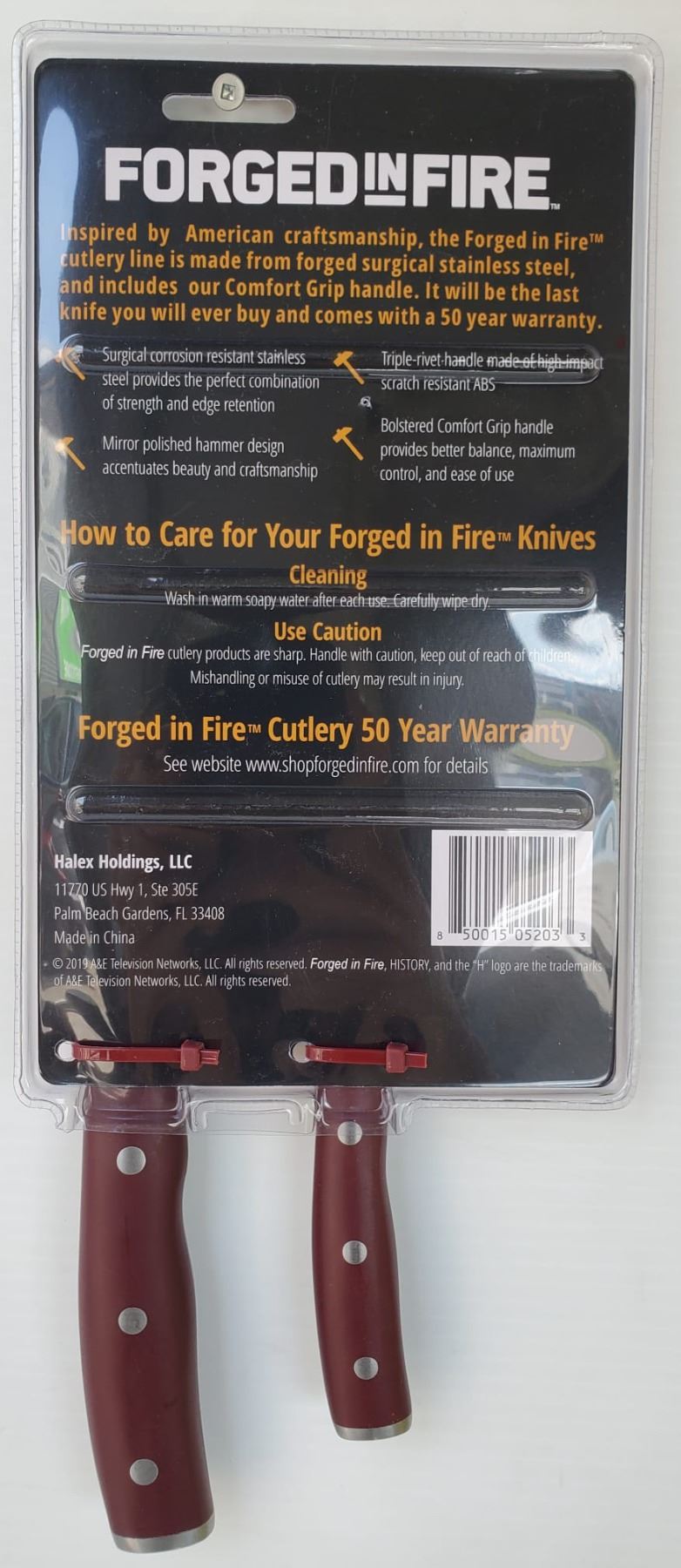 KNIFE. SURGICAL CORROSION RESISTANT STAINLESS STEEL, FULL TANG BLADE, HIGH END HAMMERED FINISH TO REDUCE FRICTION. TRIPLE RIVETED HANDLE W/ HIGH IMPACT ABS HANDLE 8" CHEFS KNIFE & 3.5" PARING KNIFE.