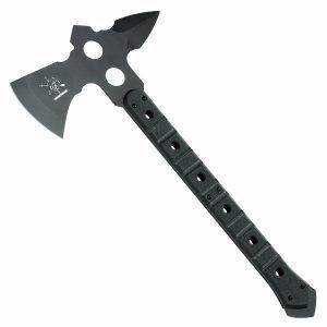 ATC was asked to design a fighting axe that could be both used in extreme situations and that could be accurately thrown. The ATC Comanche has been completely manufactured by our company, following US Special Forces specifications. The axe is very well balanced, with G10 handles greatly increasing the grip performance. Included is a carry sheath that has been specially developed and designed for carrying ease. These are very special tools that will greatly aid the end user in the field. Features Overall Length: 18.22 inch Blade Style: Tomahawk Blade Material: Stainless Steel N690Co Handle Material: G10 Composite Weight: 35.27 oz. Includes: Carry Sheath