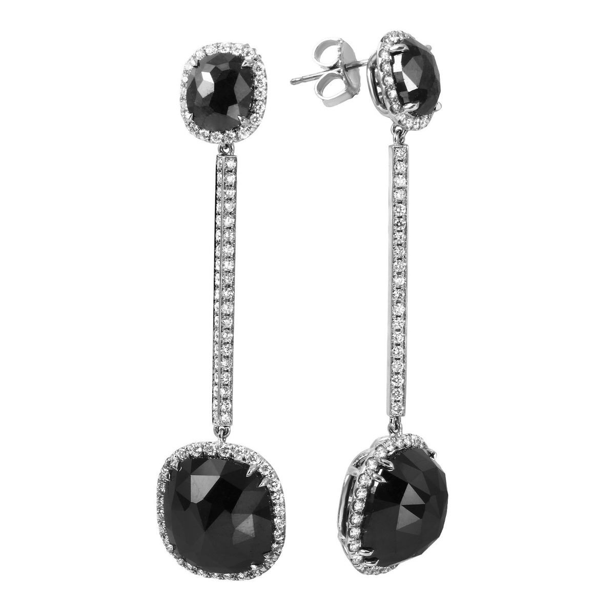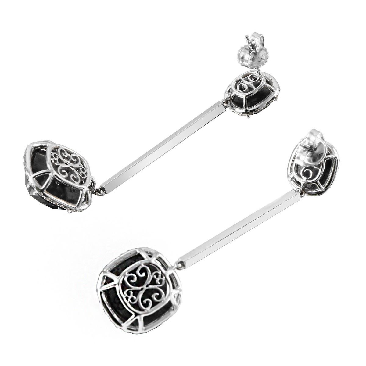 One pair stamped & tested 18KT white gold ladies custom wax & cast diamond drop earrings with friction posts with a bright polish finish. 2.2" in length. Identified with markings of "18K". Condition is new. Containing: One prong set geodesic cut diamond, measuring 13.60 x 13.00 x 7.20mm (depth est.) approximate weight of 8.92ct. Color of Fancy Black. Cut is Excellent. One prong set geodesic cut diamond, measuring 13.60 x 12.70 x 7.20mm (depth est.) approximate weight of 7.82ct. Color of Fancy Black. Cut is Excellent. One prong set geodesic cut diamond, measuring 8.70 x 7.60 x 5.50mm (depth est.) approximate weight of 2.05ct. Color of Fancy Black. Cut is Excellent. One prong set fancy cut diamond, measuring 8.30 x 7.50 x 5.20mm (depth est.) approximate weight of 1.88ct. Color of Fancy Black. Cut is Excellent. One Hundred Seventy-Two prong set round brilliant cut diamonds, measuring 1.50 - 1.50 x 0.90mm (depth est.) approximate total weight of 172 Stones = 1.91ct. Clarity: VS-1 to VS-2. Color: F - G, Cut is Excellent. Approximate Total Weight of Diamonds 22.58ct. Total Weight of Drop Earrings 12.30gm. The descriptions listed should not be construed as an appraisal. The detail is provided as a guideline for color, clarity, weights and measurements to the best of our ability. We welcome inspections. WE SHIP WORLDWIDE!