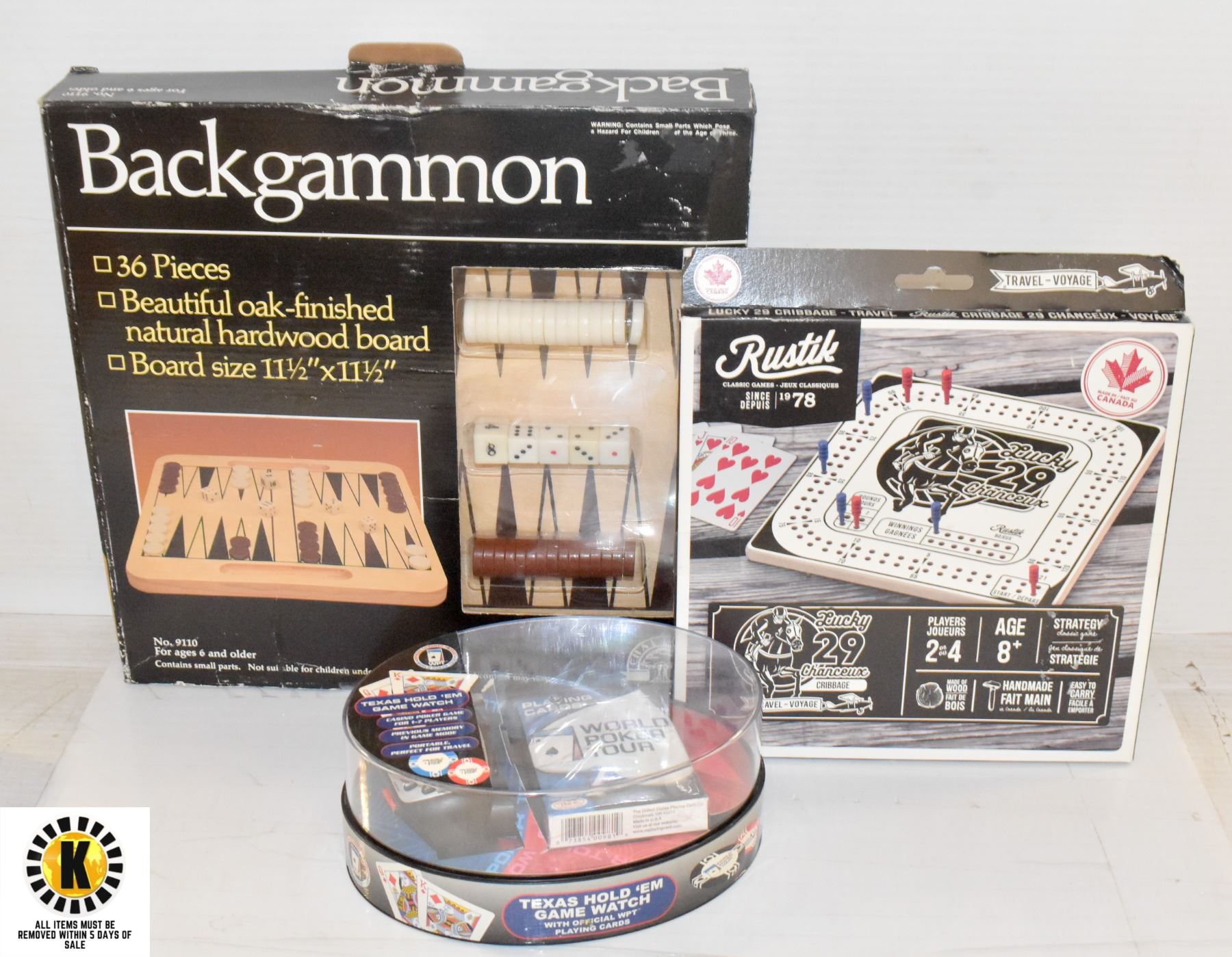 W/TEXAS HOLD 'EM WATCH, CHALLENGE MASTER OAK FINISHED BACKGAMMON