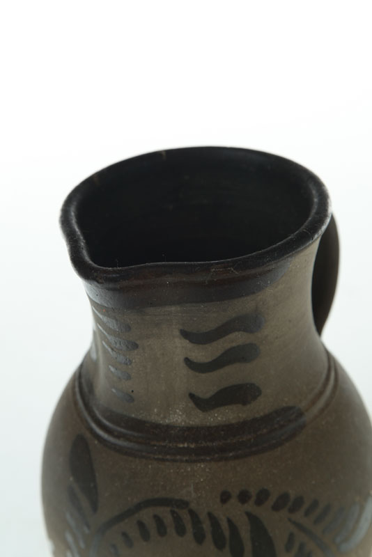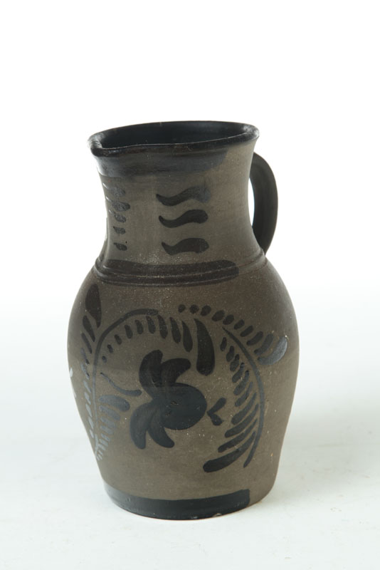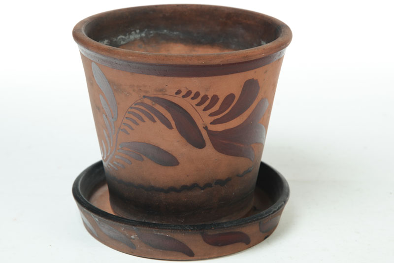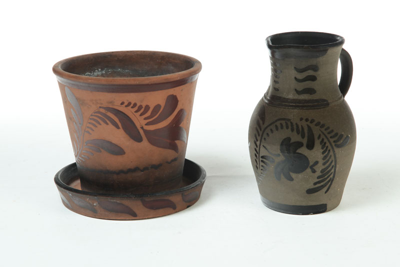 American, mid 19th century. Brushed slip designs. Fuchsia on the pitcher, 9 1/4"h., foliate on the flower pot with attached saucer, 7 1/2"h. Hairlines.