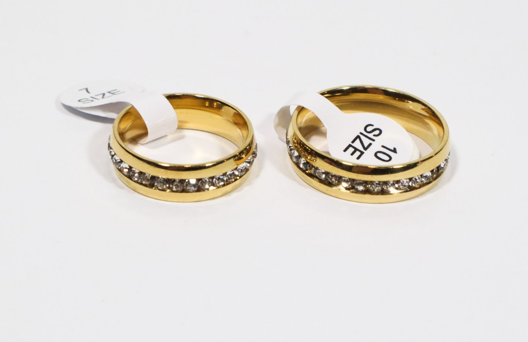 STAINLESS STEEL RING SET. RHINESTONE ACCENTS AROUND THE WHOLE BAND. HAVE COMFORT FIT FEEL BAND