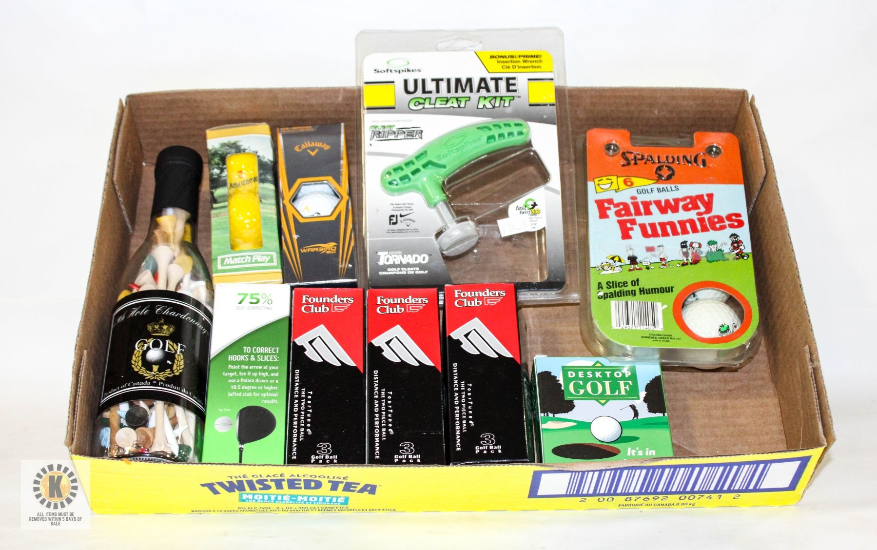 BALLS (9), VINTAGE CANADIAN TIRE (3) YELLOW BALLS, 19TH HOLE CHARDONNAY GOLF TEES MADE IN CANADA, ULTIMATE CLEAT KIT, SPALDING FAIRWAY FUNNIES GOLF BALLS & OTHER BALLS **ALL ITEMS MUST BE REMOVED BY 5PM SATURDAY, MARCH 29TH 2025. ALL REMAINING ITEMS WILL BE SUBJECT TO A $6.00 PER DAY STORAGE CHARGE. ANY ITEMS REMAINING AFTER MONDAY, APRIL 21ST 2025 WILL BE CONSIDERED FORFEITED. NO REFUNDS WILL BE ISSUED FOR FORFEITED ITEMS. TO SCHEDULE A PICK UP APPOINTMENT CLICK HERE