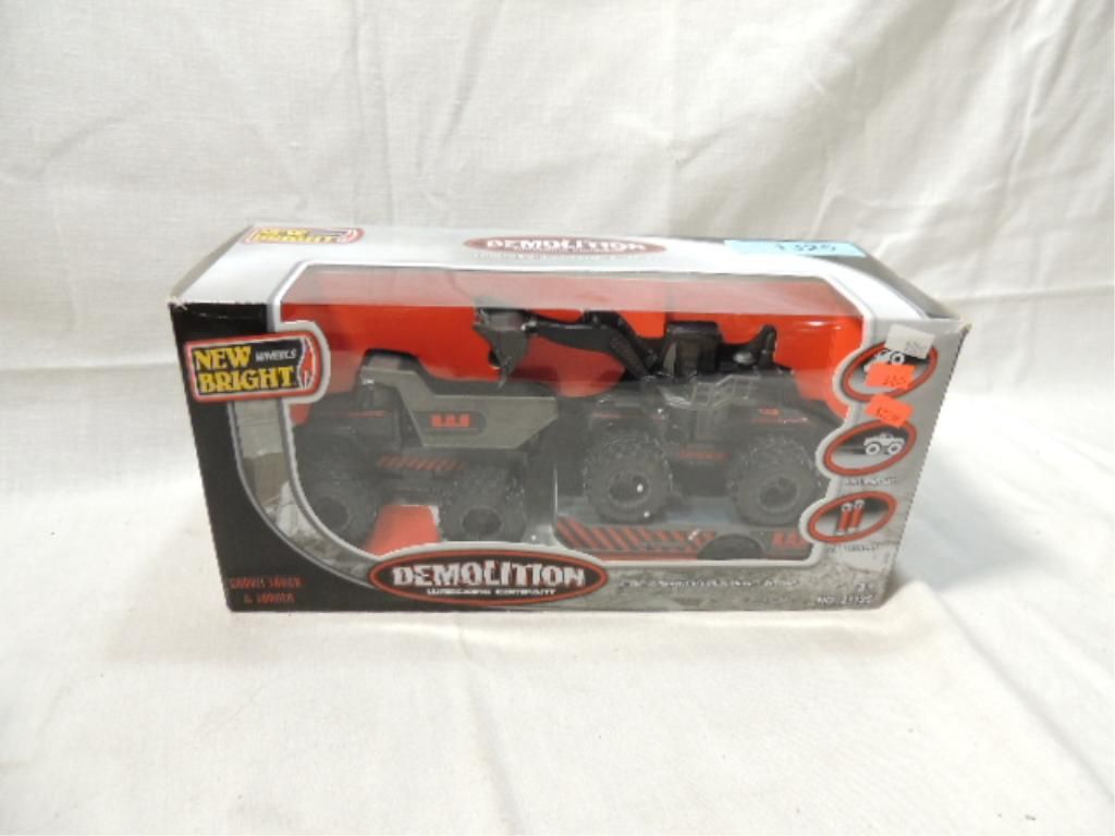 NEW DEMOLITION WEAKING COMPANY BATTERY OPERATED 4X4 DRIVE OR FREE WHEELLING GRAVEL TRUCK & LOADER TOY. AS SHOWN. SEE PHOTO FOR DETAILS.