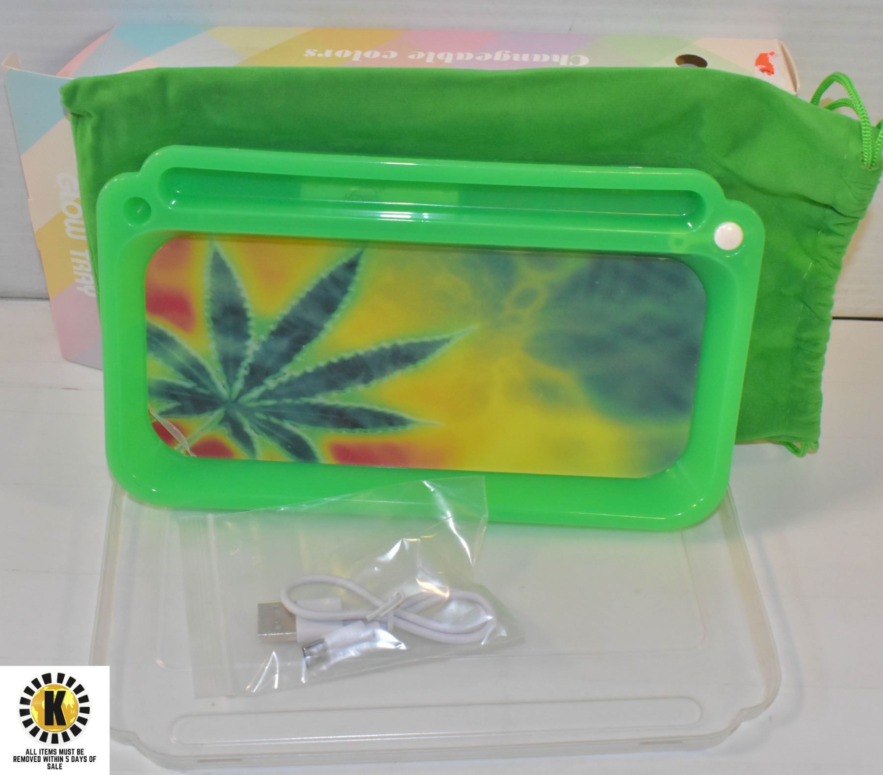 NEW GREEN CANNABIS LEAF THEMED LED ROLLING TRAY