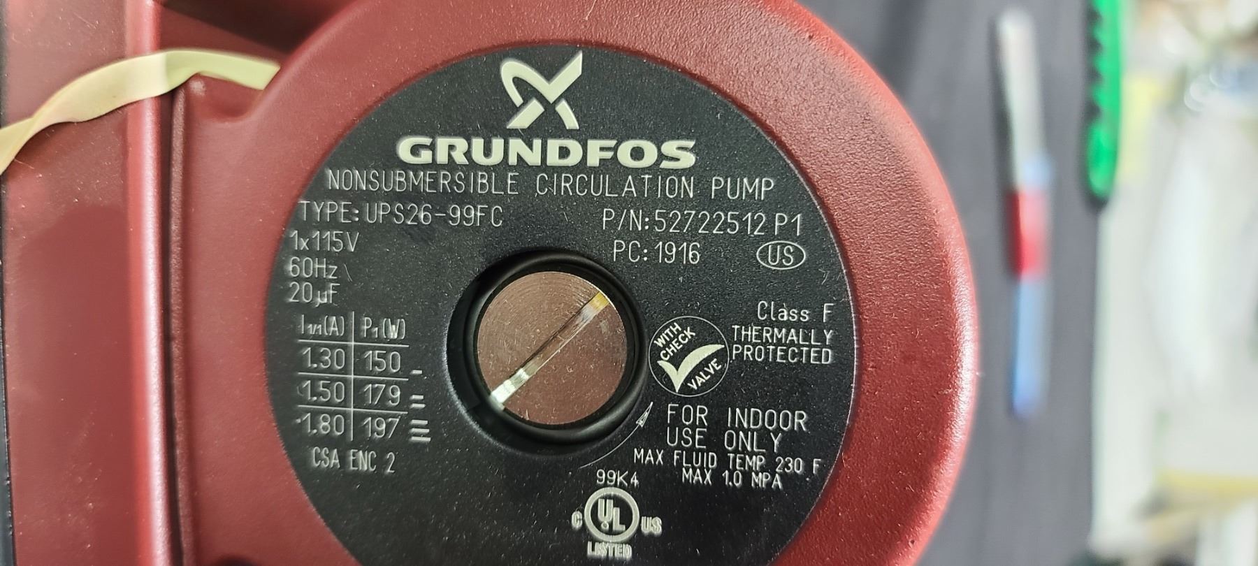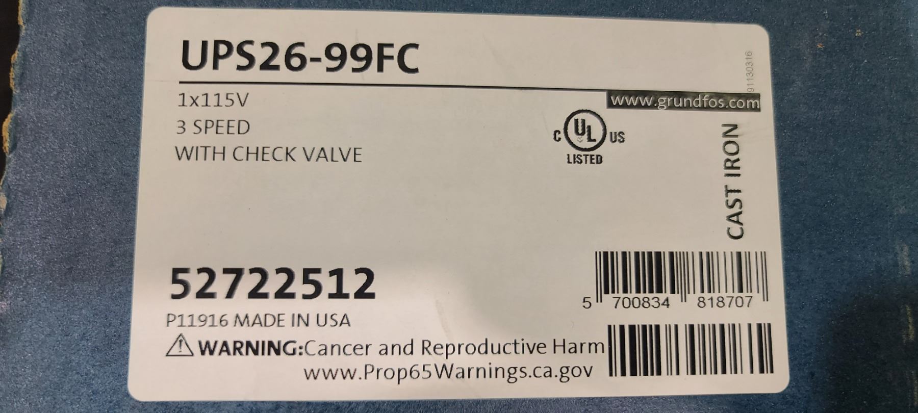 NEW GRUNDFOS NON SUBMERSABLE CIRCULATION PUMP TYPE UPS26-99FT 1 X 115V 60HZ CLASS F. THREE SPEED WITH VALVE CHECK. P/N 527225PI