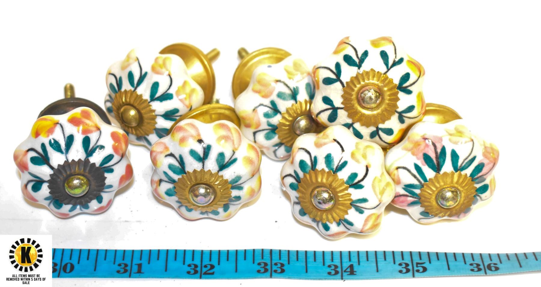 SET OF 7 HAND PAINTED PORCELAIN & BRASS KNOBS WITH HARDWARE, MADE IN INDIA.