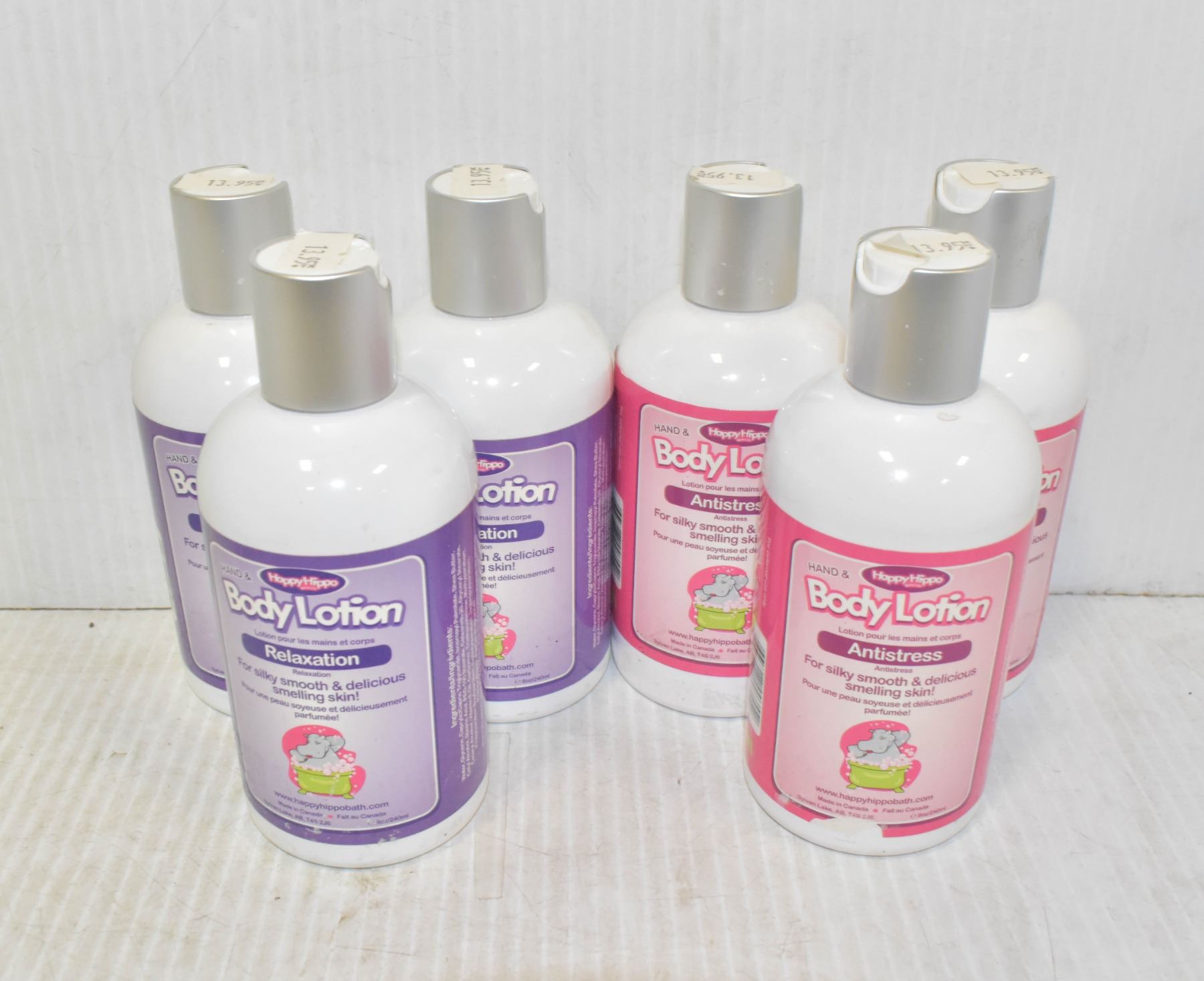 1 FLAT OF 6 8OZ CONTAINERS OF HAPPY HIPPO HAND AND BODY LOTION 3 ANTI-STRESS 3 RELAXATION (LAVENDER) SCENT. **NO SHIPPING****ALL ITEMS MUST BE REMOVED BY 5PM MONDAY, SEPTEMBER 17, 2022. ALL REMAINING ITEMS WILL BE SUBJECT TO A $6.00 PER DAY STORAGE CHARGE. ANY ITEMS REMAINING AFTER MONDAY, SEPTEMBER 17, 2022 WILL BE CONSIDERED FORFEITED. NO REFUNDS WILL BE ISSUED FOR FORFEITED ITEMS. TO SCHEDULE A PICK UP APPOINTMENT CLICK HERE