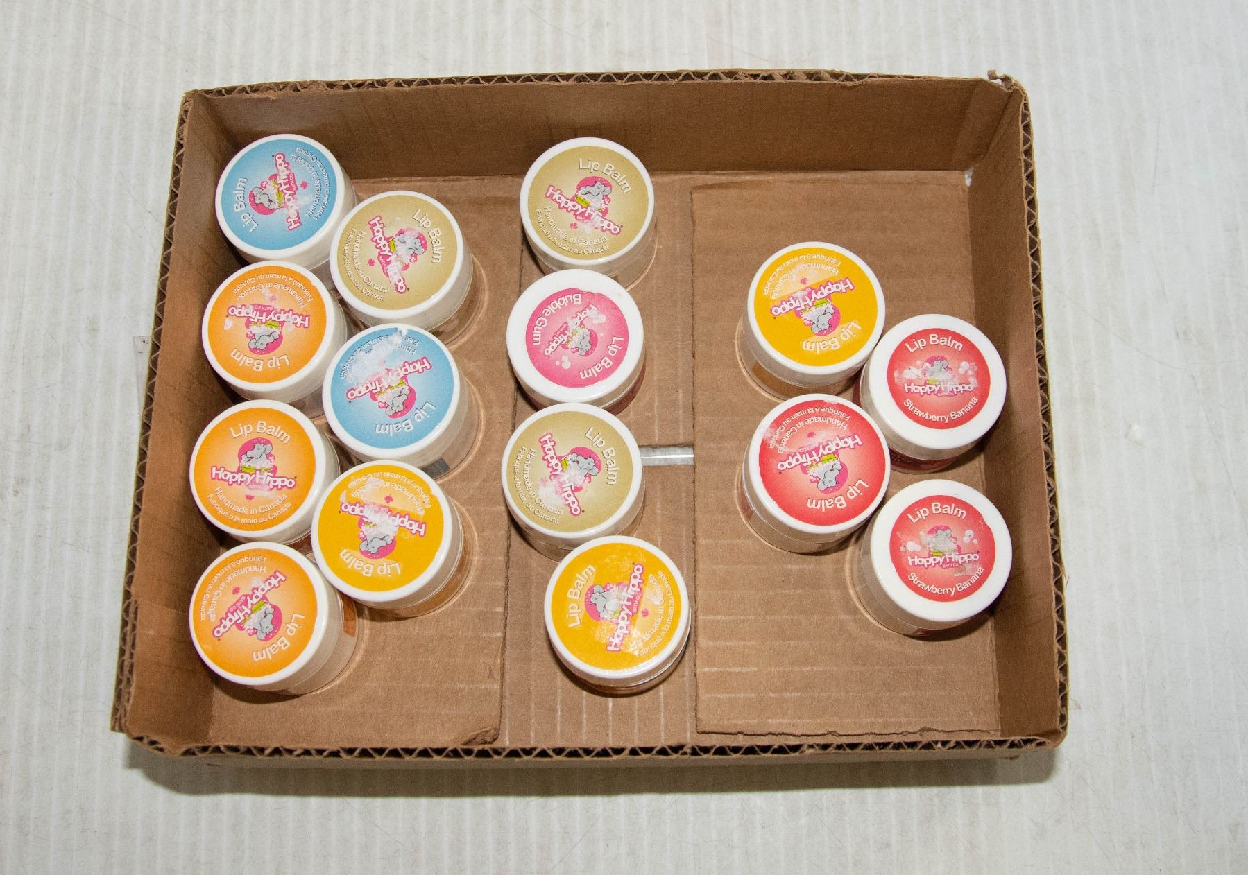 1 FLAT OF 15 HAPPY HIPPO LIP BALMS ASSORTED FLAVORS OF BUBBLEGUM STRAWBERRY/BANANA STRAWBERRIES AND CREAM HAWAIIAN SUNRISE VERRY VANILLA TRIPLE BERRY MANGO MANIA**ALL ITEMS MUST BE REMOVED BY 5PM MONDAY, SEPTEMBER 17, 2022. ALL REMAINING ITEMS WILL BE SUBJECT TO A $6.00 PER DAY STORAGE CHARGE. ANY ITEMS REMAINING AFTER MONDAY, SEPTEMBER 17, 2022 WILL BE CONSIDERED FORFEITED. NO REFUNDS WILL BE ISSUED FOR FORFEITED ITEMS. TO SCHEDULE A PICK UP APPOINTMENT CLICK HERE