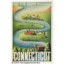 <B>New Haven Railroad (Circa 1950)</B></I> Travel Poster (28" X 42"). The New Haven was an extremely passenger oriented railroad and a great proportion of its revenues came from New England vacation travel. An important element of the New Haven's postwar vacation travel marketing campaign was a series of seven travel posters, which promoted popular vacation destinations directly served by New Haven Railroad passenger trains. Designed with a somewhat stylized family resemblance by an artist named Ben Nason and executed in bright colors using an airbrush technique, these travel posters were printed starting about 1941. Distribution was curtailed during the Second World War, when all non-essential travel was actively discouraged by the railroad. However, the Nason posters were widely distributed to stations, ticket offices, travel agencies, and other interested parties starting in late 1945. The Nason posters remained in service (although perhaps in limited numbers towards the end) up through at least the middle of 1955. The New Haven Railroad was a dominating presence throughout the state of Connecticut. Nason's Connecticut poster depicted the stylized path of a river coursing from the ocean into the New England countryside. Very Fine condition on Linen.