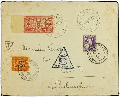 1932 Envelope from New Hebrides addressed to Cochinchine bearing 40 c (4d) red/yellow (SG F47) tied by PORT VILLA datestamp, underpaid with NEW HEBRIDES tax handstamp, routed via Haiphong and Saigon and bearing Indo-China postage dues 3 c violet (Yvert 35) and 2 c yellow/red (Yvert 61) applied and tied by CANTHO datestamp with handstruck TAXE MINIMUM/5 CENTS in blue. Nice combination.