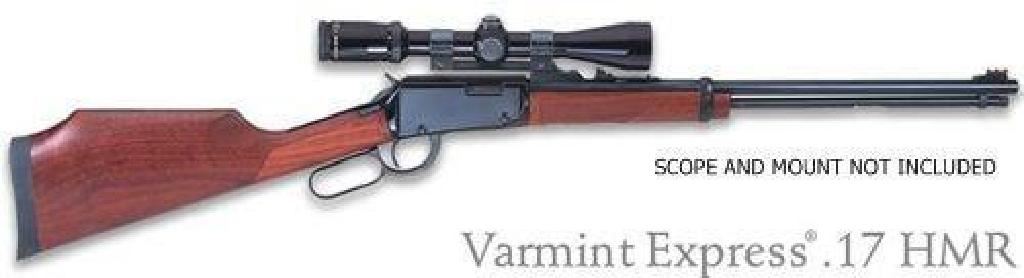 FAMILY:Varmint Express MODEL:Varmint Express TYPE:Rifle ACTION:Lever Action FINISH:Blue STOCK/FRAME:Wood Stock STOCK/GRIPS:Wood CALIBER/GAUGE:17 HMR CAPACITY:11+1 BARREL:20" OVERALL LENGTH:37.5" SIGHTS:Fiber Optic SAFETY:Half Cock ADDL INFO:Monte Carlo Stock