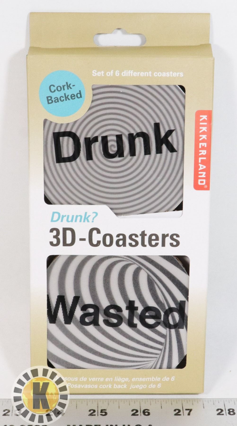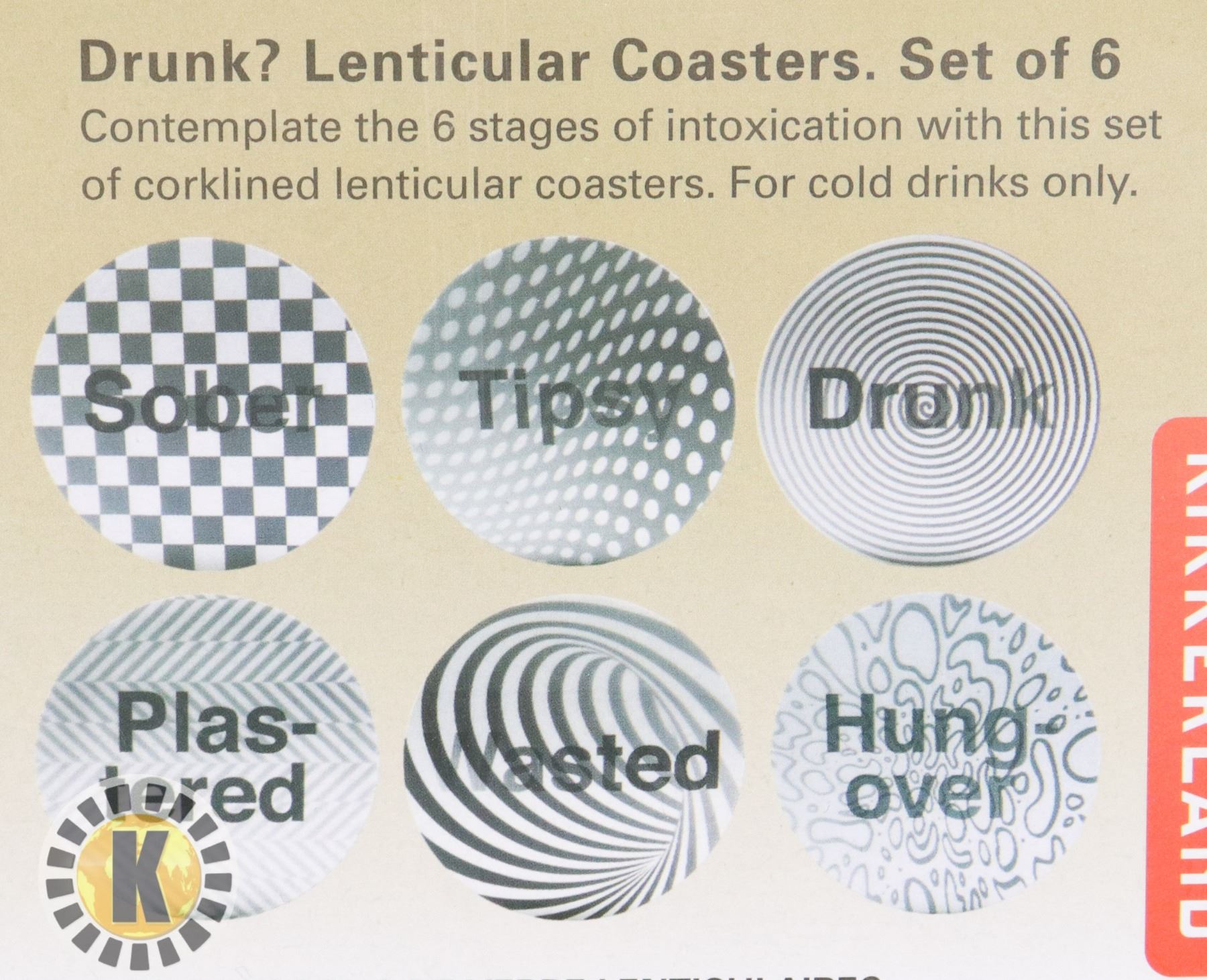 SOBER, TIPSY, DRUNK, PLAS-TERED, WASTED, AND HUNGOVER. CAN SHOW A PATTERN OR WORD, OR BOTH. CORK BACKING