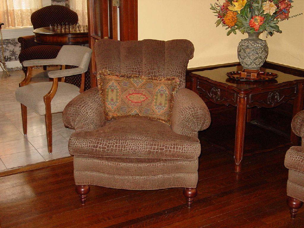 NEW HOPE PARLOR CHAIRS, GREEN WITH CROCODILE PATTERN, STATESVILLE CHAIR CO. PARLOR UPHOLSTERED CHAIRS (2X) COVERED IN DESIGNER FABRIC