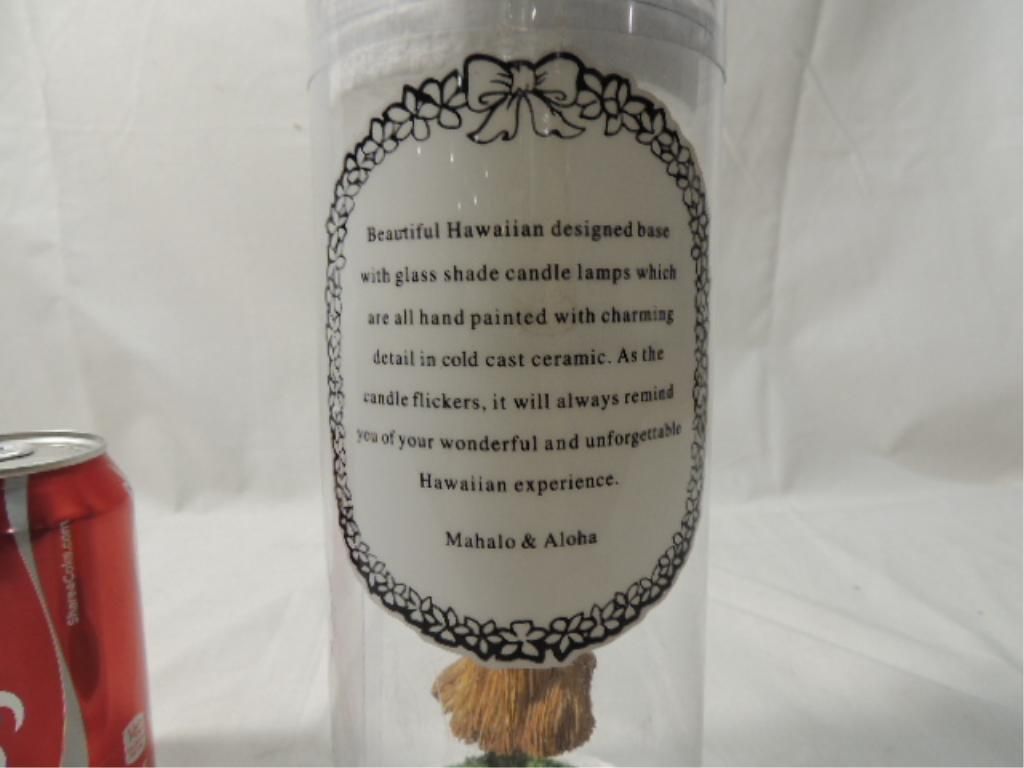 BEAUTIFUL HAWAIIAN DESIGNED BASE WITH GLASS SHADE CANDLE LAMP. HAND PAINTED WITH CHARMING DETAIL IN COLD CAST CERAMIC. AS SHOWN. SEE PHOTO FOR MORE DETAILS.