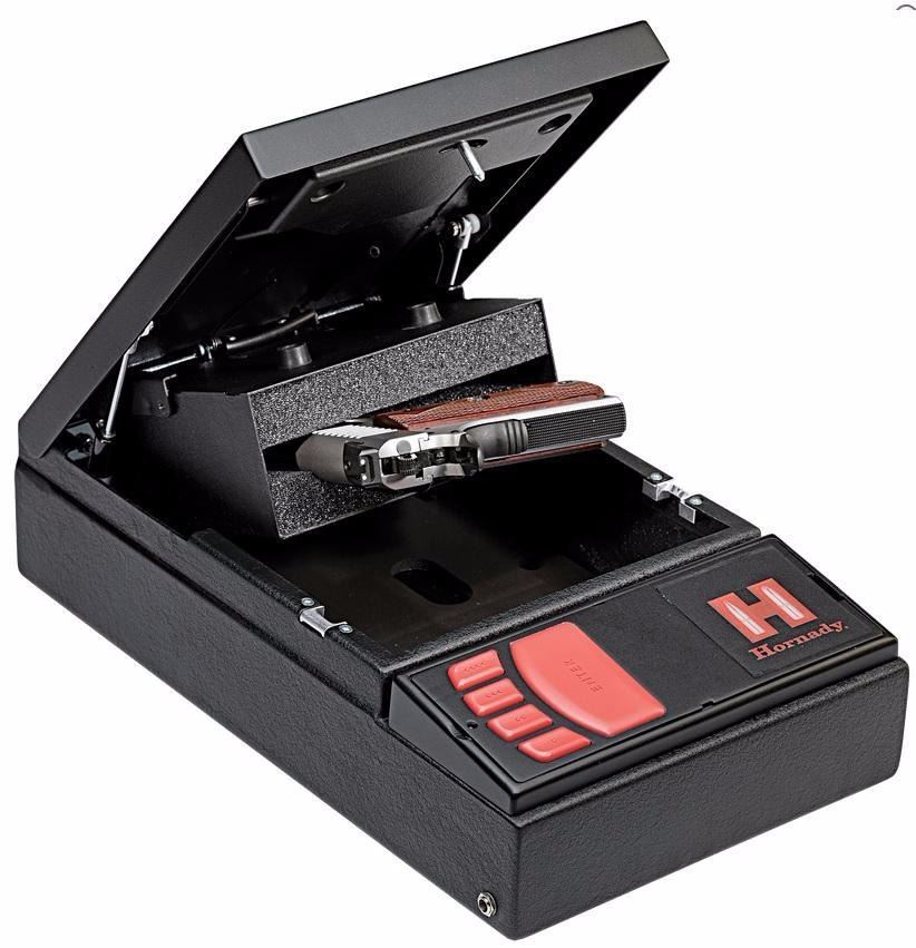 Mfr Items:Hornady Category:GUN VAULTS AND SAFES Type:Pistol Safe Color:Black Dimensions:15.5" x 9" x 3.5" Entry:RFID Bracelet/Card/Key Fob, Code, Key Lock Type:RFID, Code, Key Material:16 Gauge Steel Finish:Gloss Interior:Foam Padded Weight:15.65 lbs