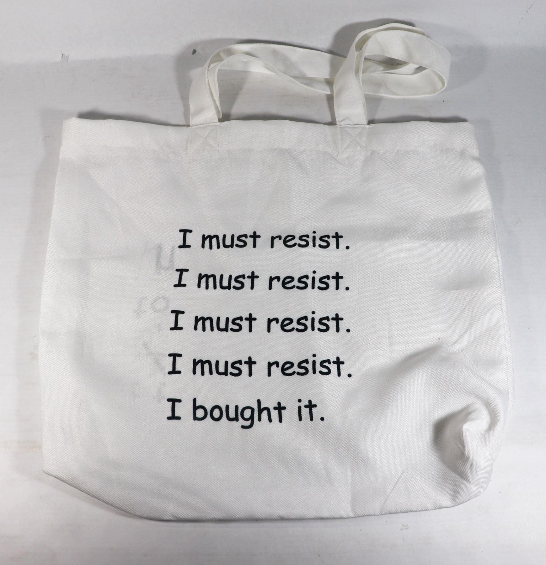 I MUST RESIST, I BOUGHT IT." TOTE MINOR FLAW IN THE PRINTING