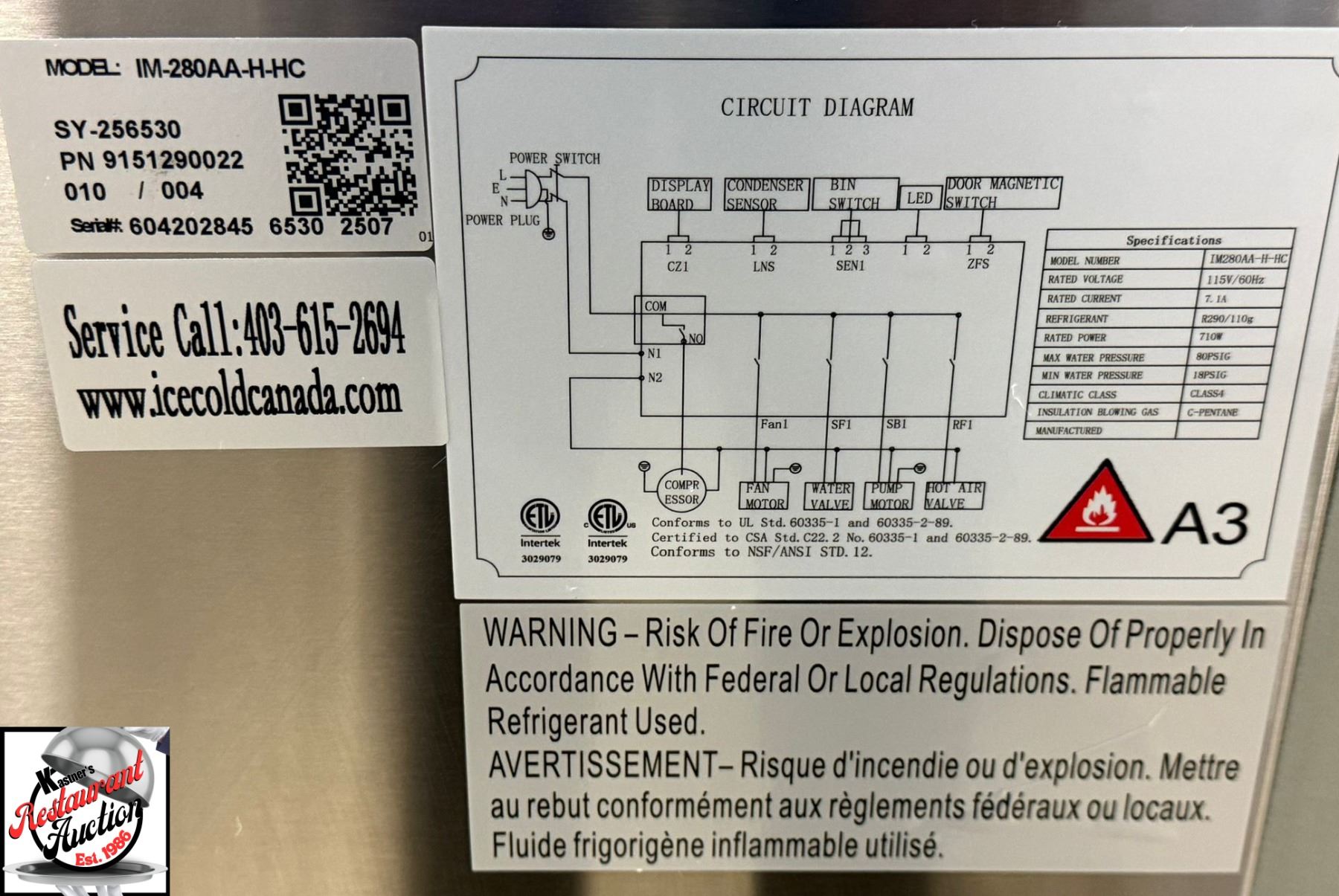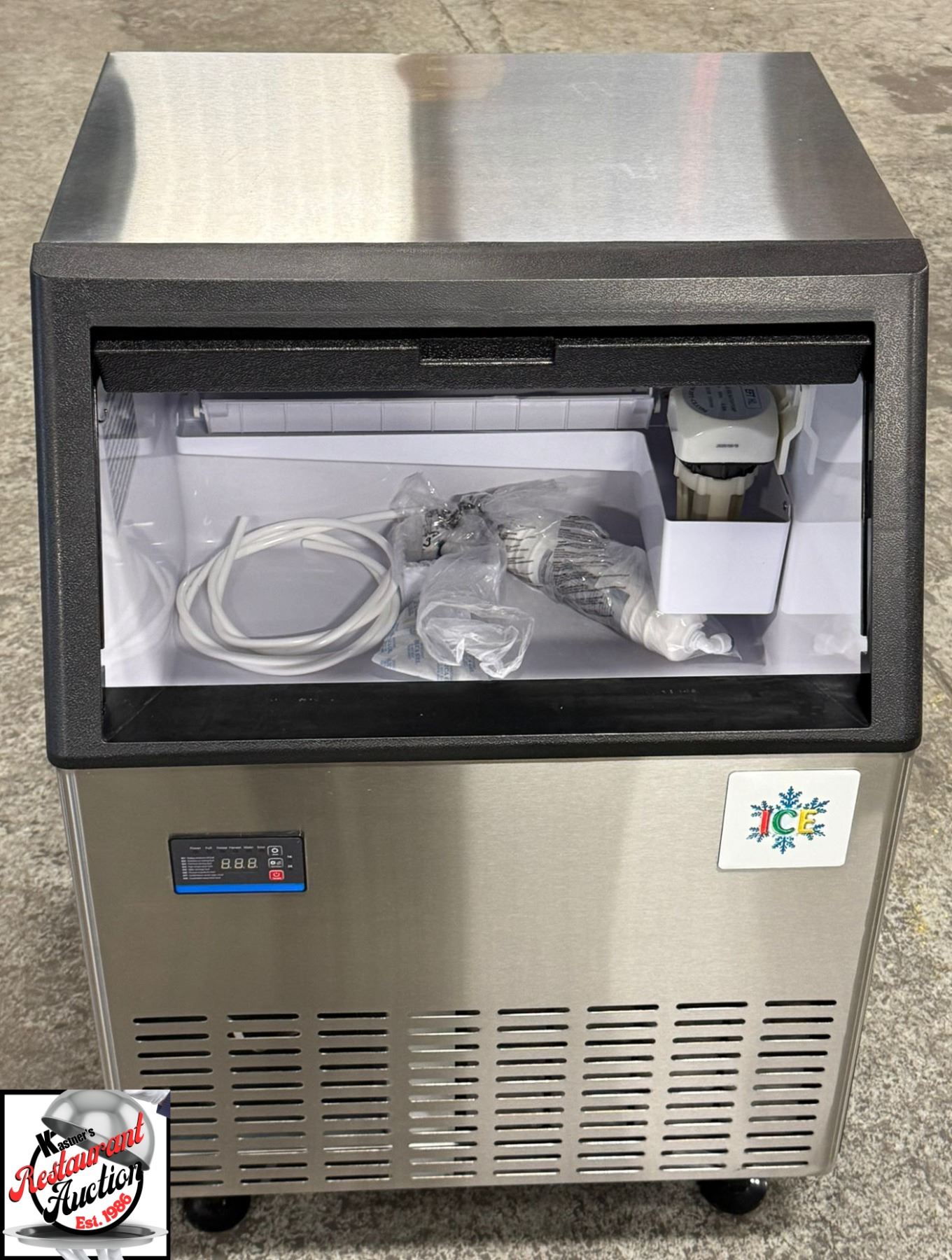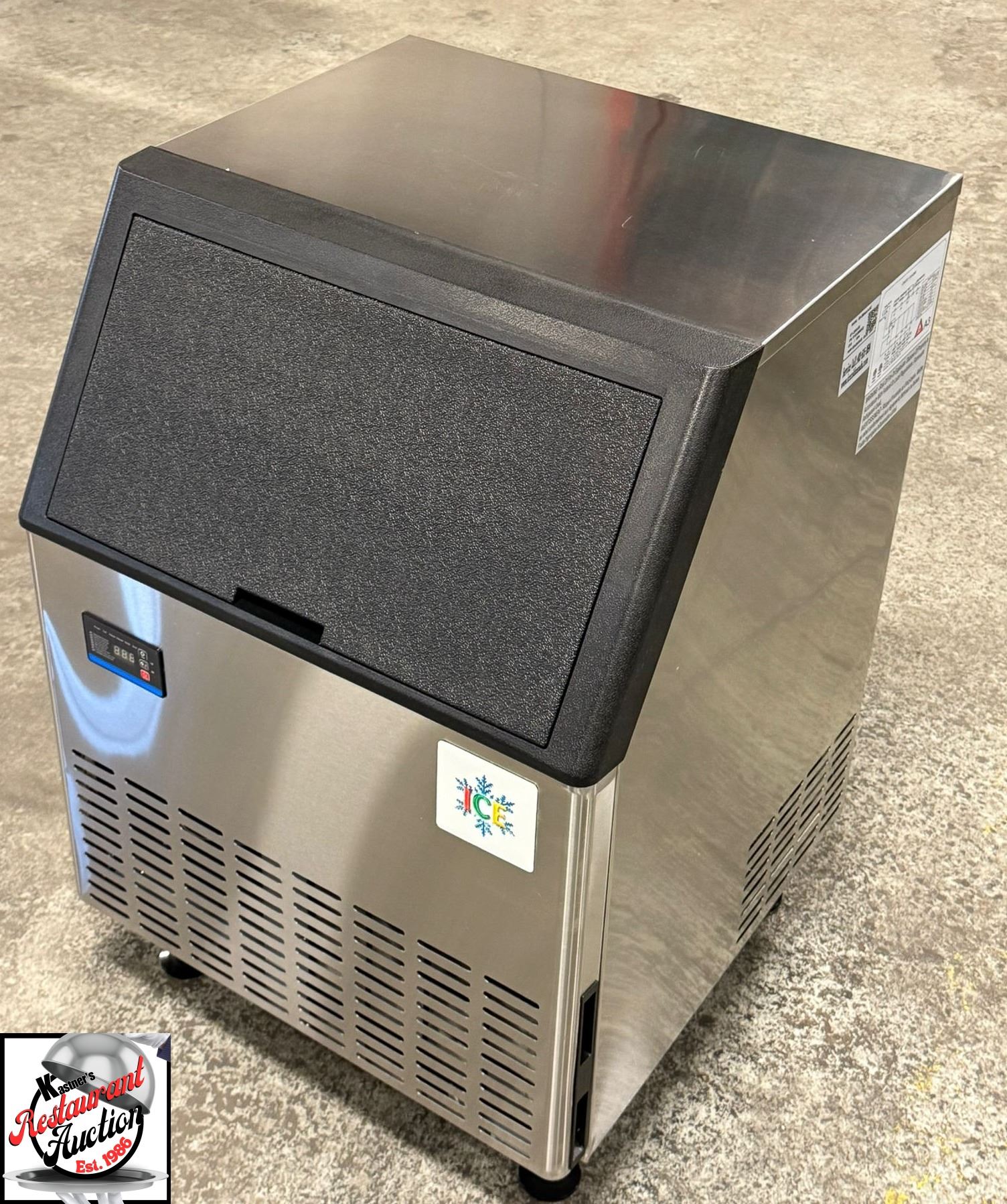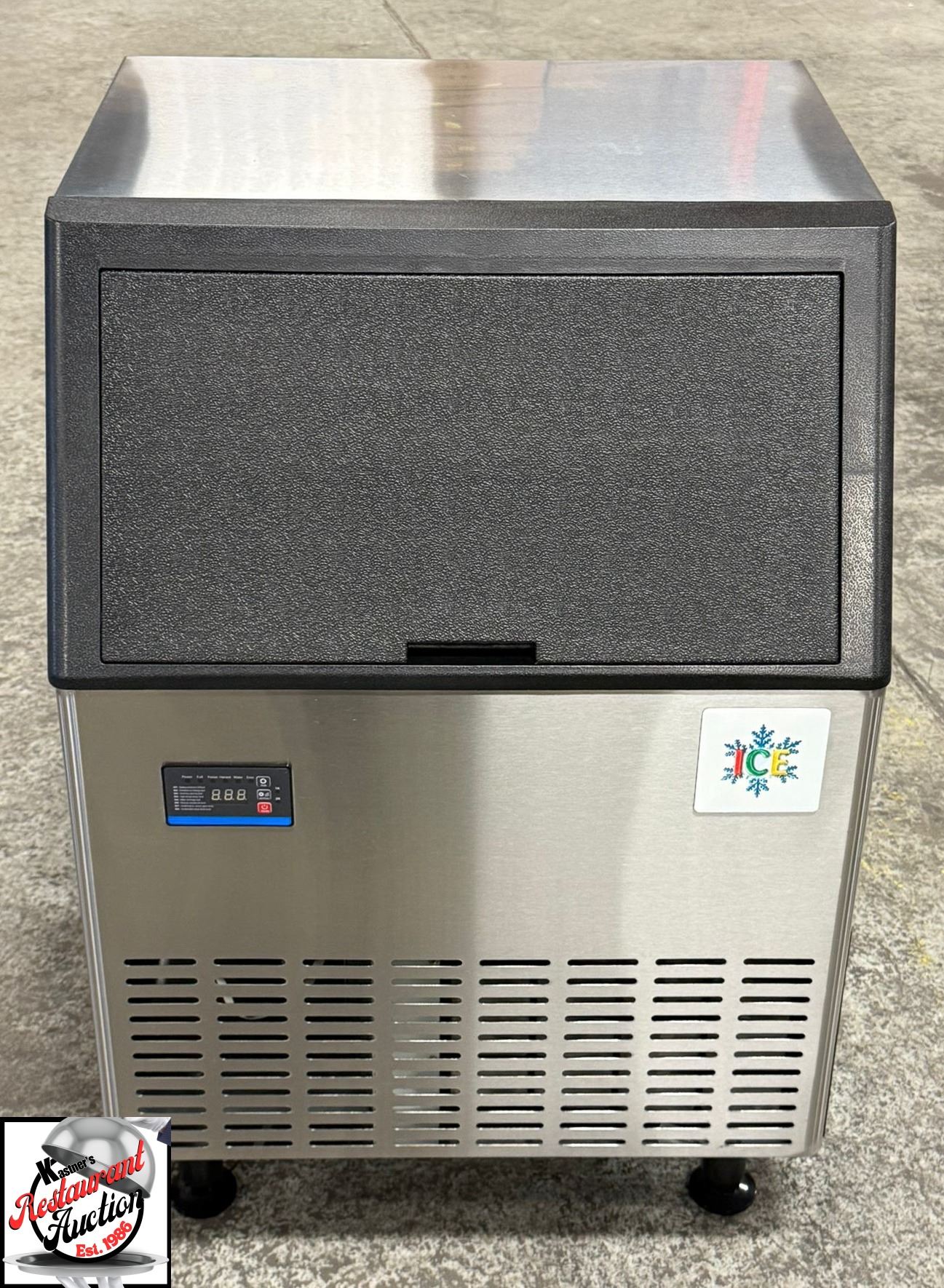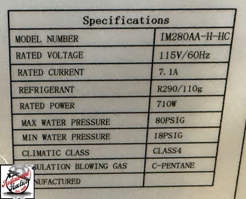 MAKES HALF SIZED CUBES, BUILT IN STORAGE BIN, PRODUCES UP TO 280 / 24 HOURS, 80LBS ICE STORAGE CAPCITY, DIGITAL CONTROLS TO CONTROL ICE THICKNESS, FRONT VENTILATION, VERTICAL WATER DELIVERY RESULTING IN ICE DROPPING IN SHEETS MUST BE BROKEN APAR, MODEL # IM-280AA-H-HC, 115 VOLTS, 60 HZ, 7.1 AMPS, REFRIGERANT R290/110G, 710 WATTS, 26" X 26" X 33" * THIS UNIT IS BRAND NEW IN BOX WITH A 1 YEAR COMPREHENSIVE WARRENTY *