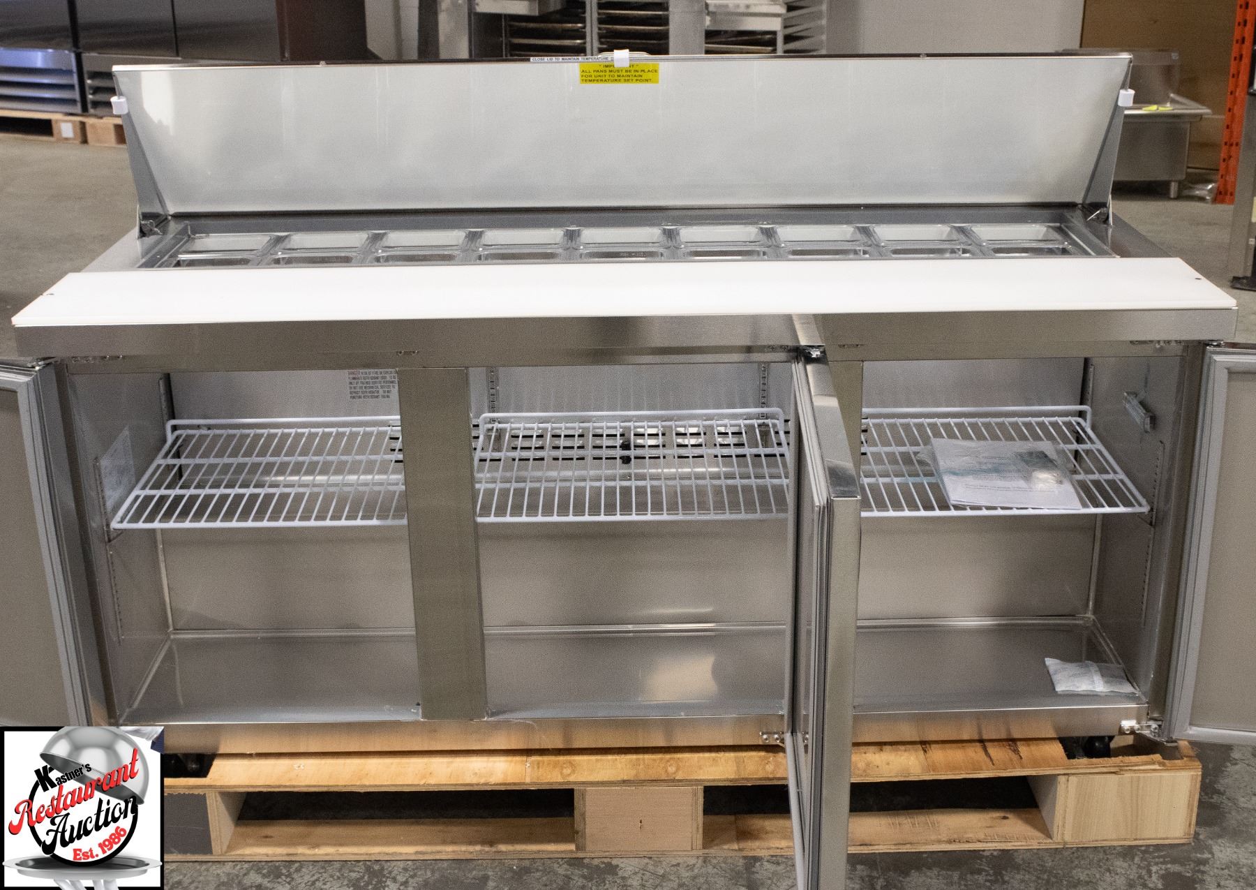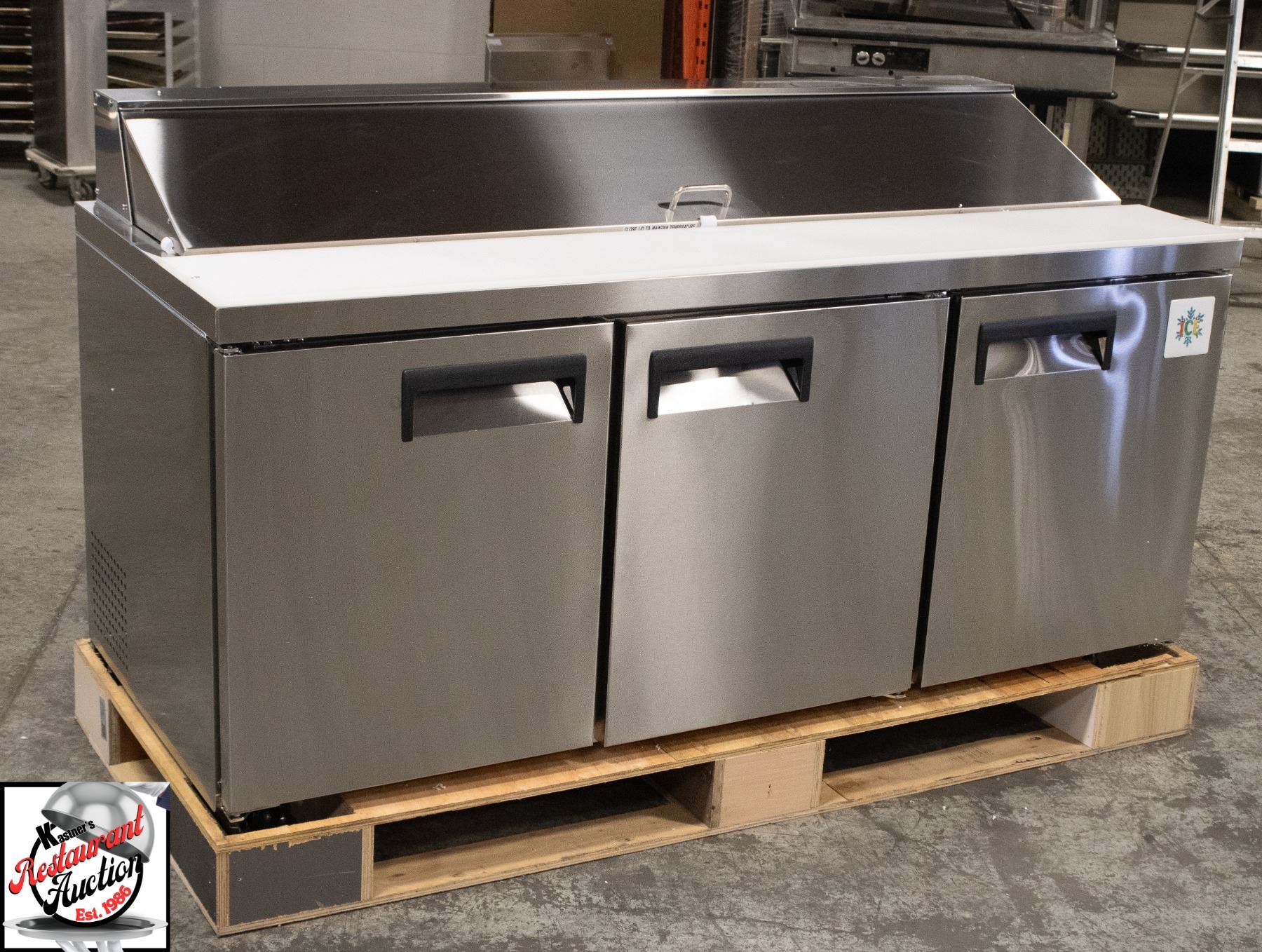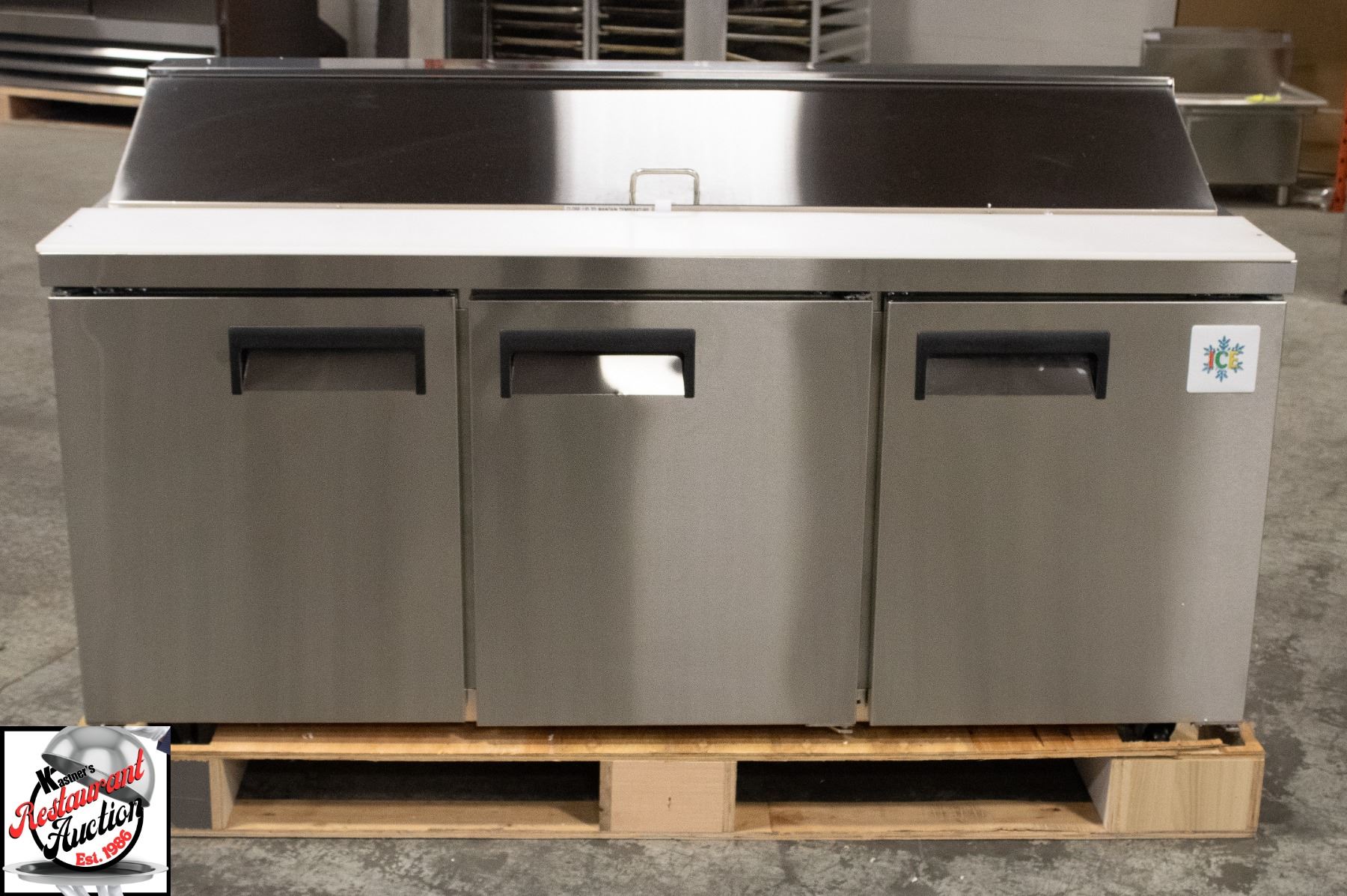 STAINLESS STEEL EXTERIOR AND INTERIOR, ROUNDED INTERIOR CORNERS FOR EASIER CLEANING, POSITIVE SEAL SELF CLOSING DOORS W/ 90° STAY OPEN FEATURE, HOLDS TEMPERATURES BETWEEN 33°F - 41°F, ELECTRONIC CONTOL SYSTEM, ADJUSTABLE PVC COATED SHELVES, HEAVY DUTY CASTORS, EASY ACCESS CONDENSING UNIT, MODEL # PREP-3D-71, REFRIGERANT R290, AC 115 VOLTS, 60 HZ, 7.8 AMPS, 780 WATTS, 156 KG, 71" X 29.5" X 44" * THIS UNIT IS BRAND NEW IN BOX WITH A 1 YEAR COMPREHENSIVE WARRENTY *