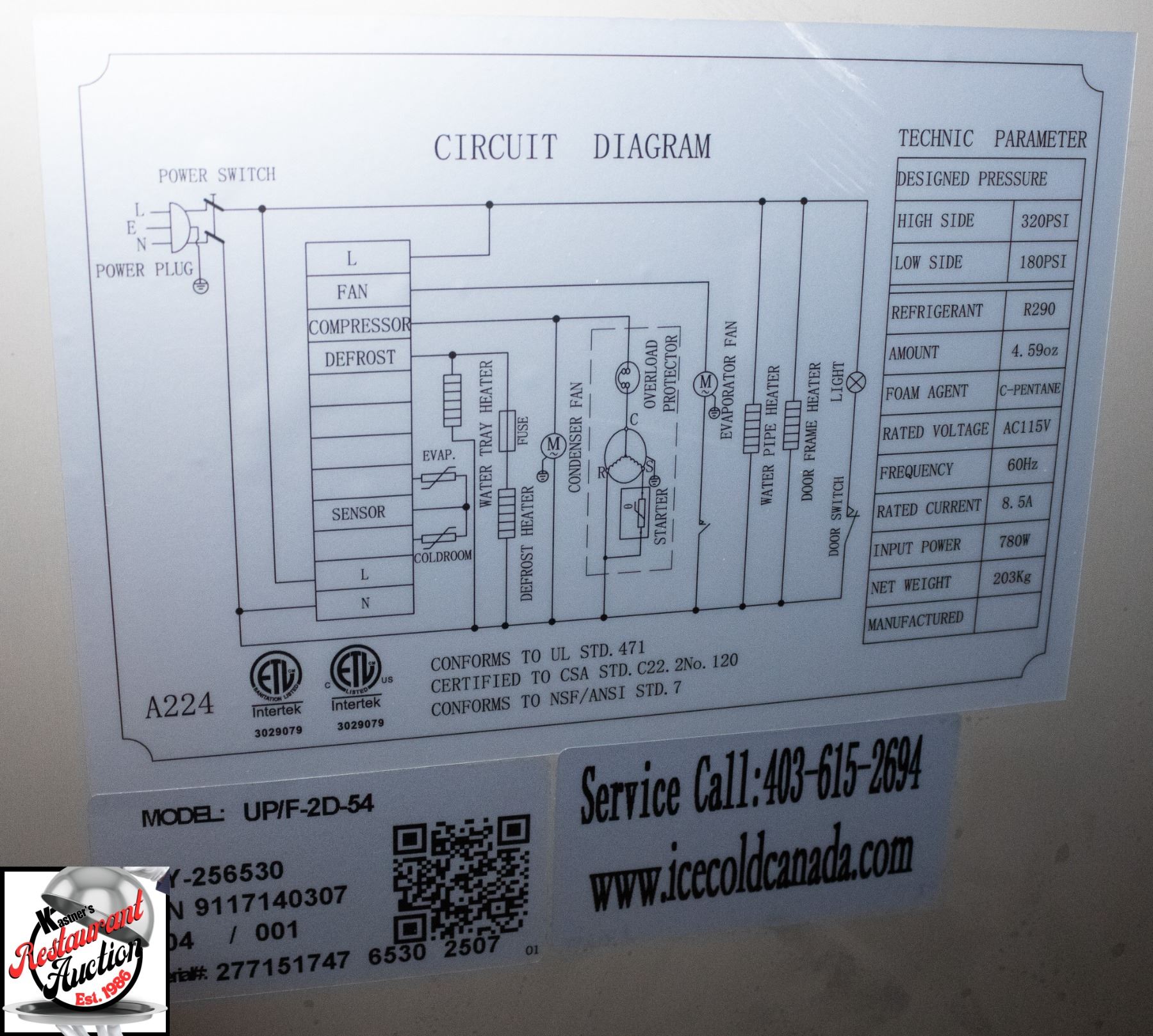 BOTTOM MOUNT COMPRESSOR,ROUNDED CORNERS FOR EAISER CLEANING,SELF CLOSING DOORS, HOLTS TEMPERATURES BETWEEN -8°F - 0°F, ELECTRONIC CONTROL SYSTEM, ADJUSTABLE PVC COATED SHELVES, MODEL # UP/F-2D-54, REFRIGERANT R290, AC 115 VOLTS, 60 HZ, 8.5 AMPS. 780 WATTS, 203 KG, 53" X 33" X 84" * THIS UNIT IS BRAND NEW IN BOX WITH A 1 YEAR COMPREHENSIVE WARRENTY *
