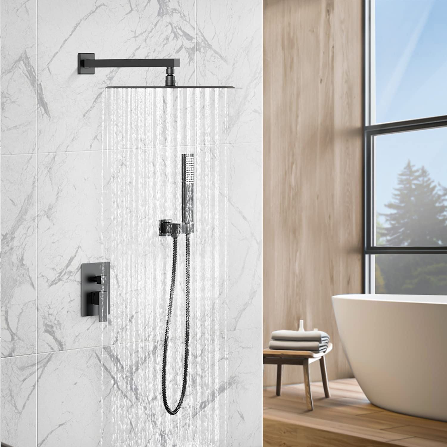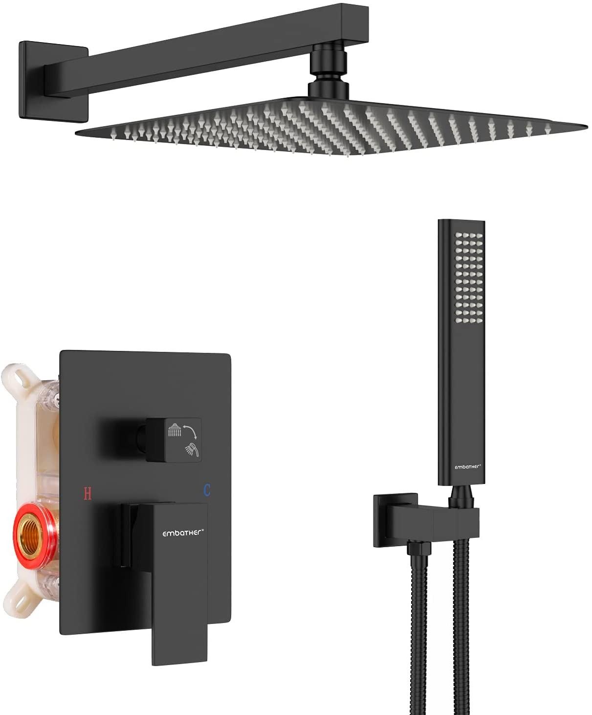 MATTE BLACK FINISH, BALANCED SHOWER SYSTEM, INCLUDES PULL OUT WAND, RAIN SHOWER HEAD, FAUCET TURN KNOB OPTION, 10" MAIN HEAD, ALL PARTS CONFIRMED, INSTRUCTION MANUAL CONFIRMED
