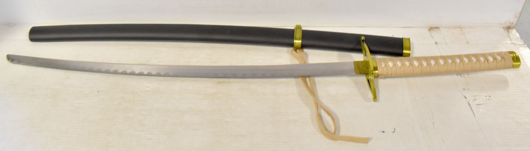 COSPLAY, DISPLAY SWORD, STEEL, BLACK SHEATH, GOLD WRAP WITH WHITE UNDERLAY ON HANDLE