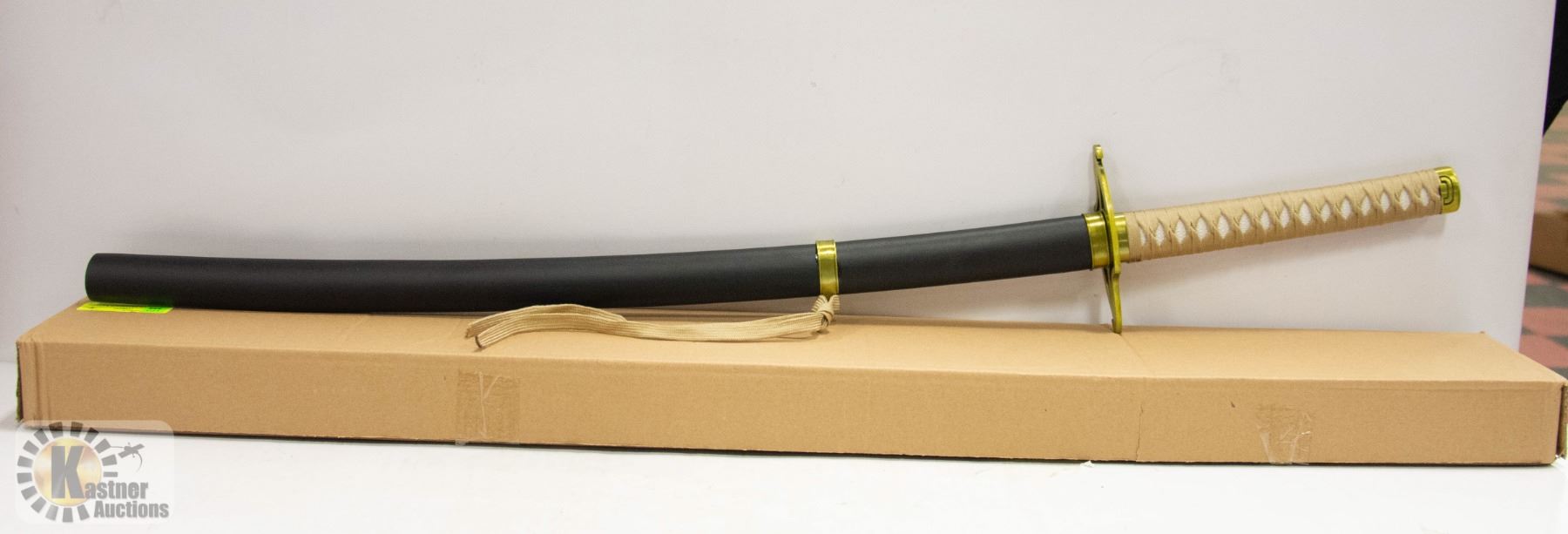 COSPLAY, DISPLAY SWORD, STEEL, BLACK SHEATH, GOLD WRAP WITH WHITE UNDERLAY ON HANDLE