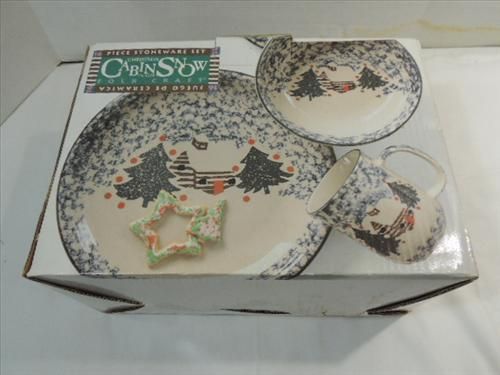 NEW IN BOX HOLIDAY 16 PIECE DINNER SET CABIN IN THE SNOW PATTERN: SETTING FOR 4. AS SHOWN. VIEW PICTURE FOR DETAIL.