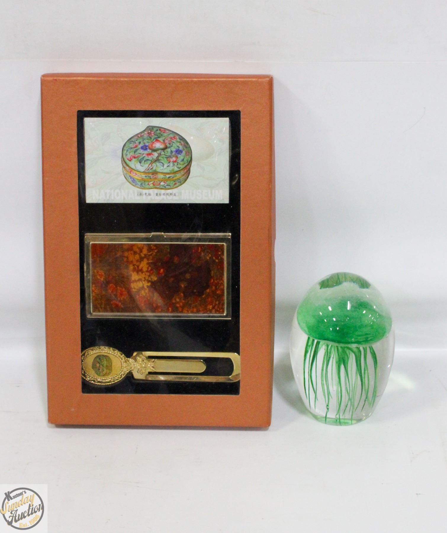 STATIONERY SET W/DYNASTY GALLERY GREEN ART GLASS PAPER WEIGHT **ALL ITEMS MUST BE REMOVED BY 5PM SATURDAY, NOVEMBER 22ND 2025. ALL REMAINING ITEMS WILL BE SUBJECT TO A $6.00 PER DAY STORAGE CHARGE. ANY ITEMS REMAINING AFTER MONDAY, DECEMBER 8TH 2025 WILL BE CONSIDERED FORFEITED. NO REFUNDS WILL BE ISSUED FOR FORFEITED ITEMS. TO SCHEDULE A PICK UP APPOINTMENT CLICK HERE