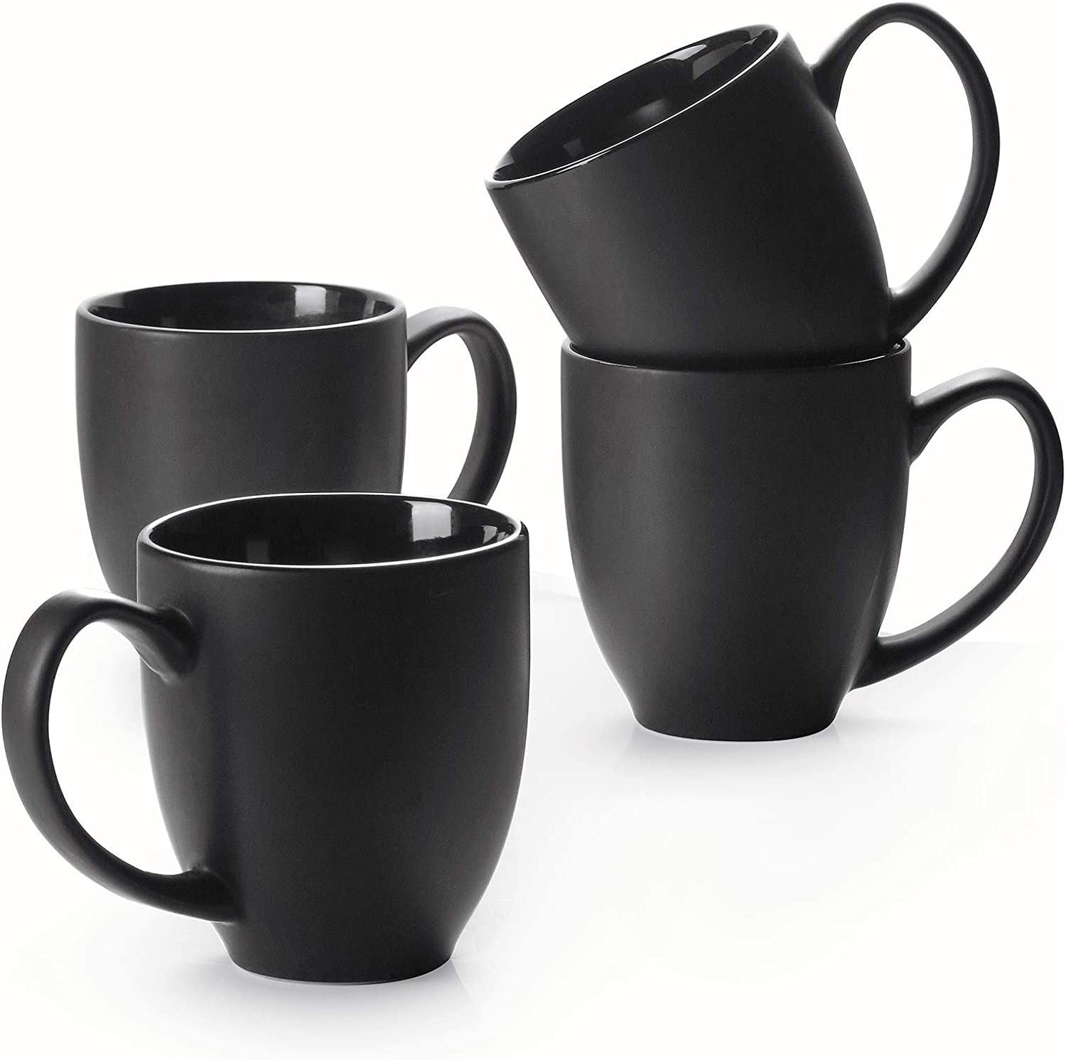 NEW IN BOX SET OF 4 BLACK COFFEE MUGS, CERAMIC