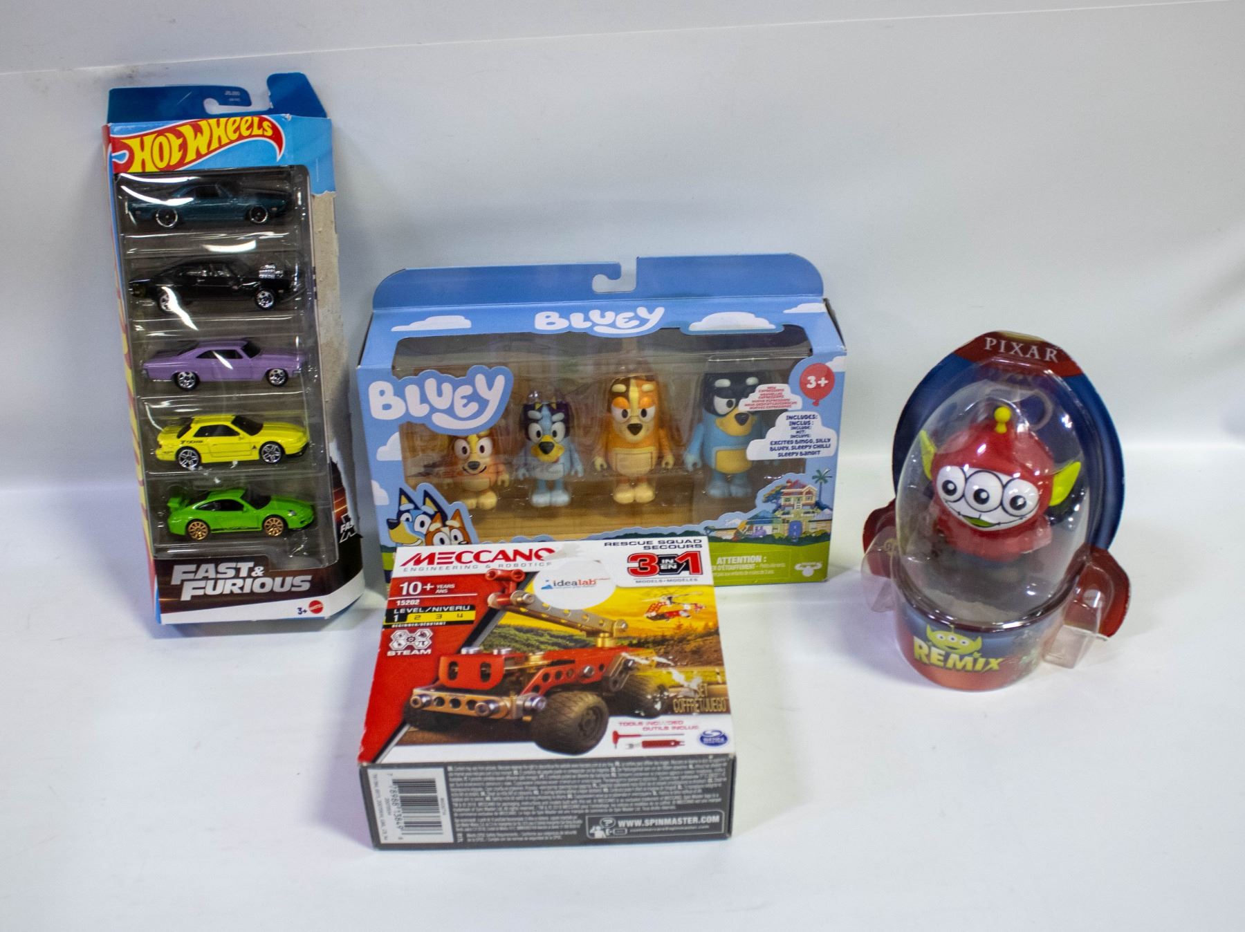 MATTEL PIXAR REMIX ALIEN & BLUEY POSEABLE 4-PACK ROBUST FIGURES, MECCANO RESCUE SQUAD 3 IN 1 & HOTWHEELS 5-PACK FAST & FURIOUS **ALL ITEMS MUST BE REMOVED BY 5PM SATURDAY, MARCH 28TH 2026. ALL REMAINING ITEMS WILL BE SUBJECT TO A $6.00 PER DAY STORAGE CHARGE. ANY ITEMS REMAINING AFTER MONDAY, APRIL 20TH 2026 WILL BE CONSIDERED FORFEITED. NO REFUNDS WILL BE ISSUED FOR FORFEITED ITEMS. TO SCHEDULE A PICK UP APPOINTMENT CLICK HERE
