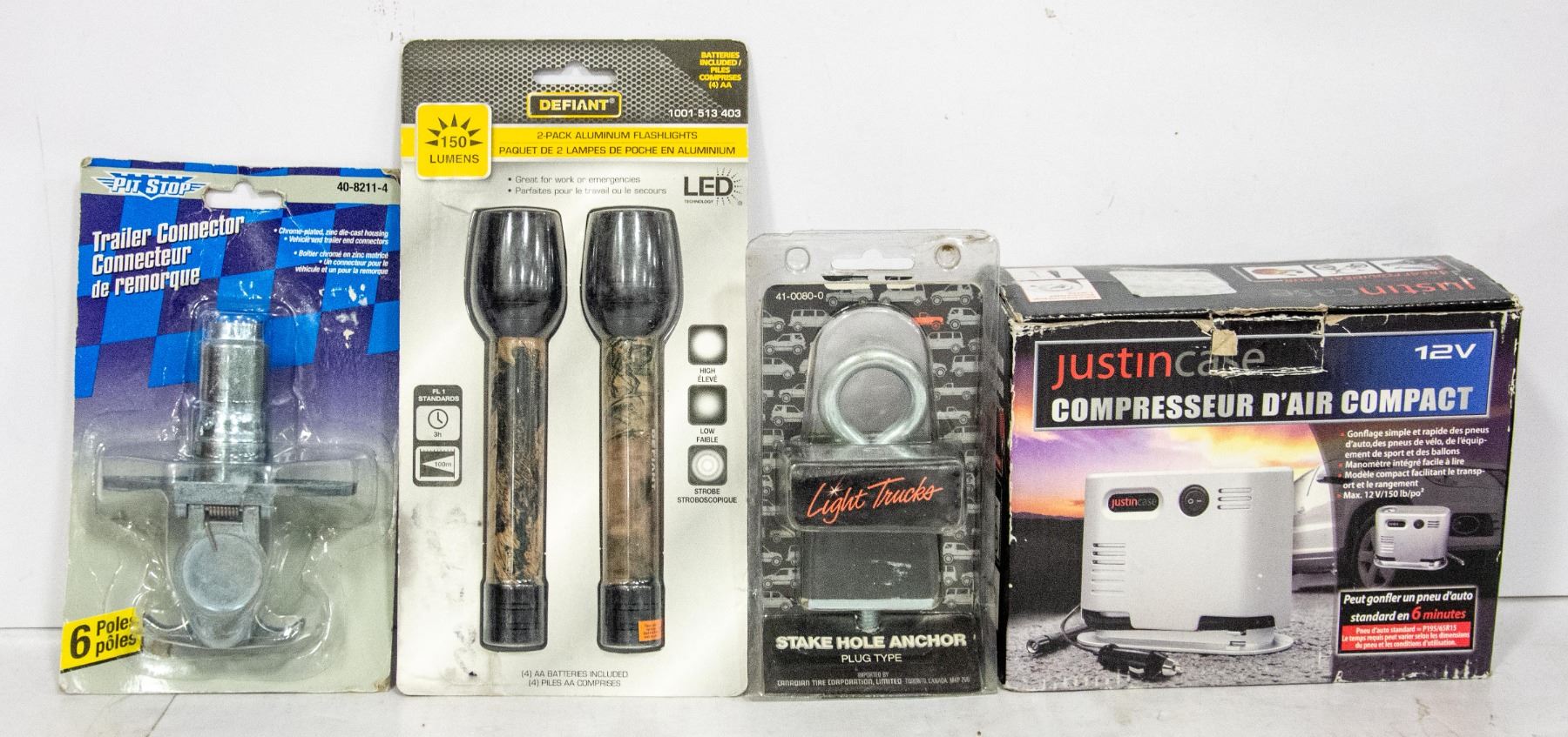 DEFIANT 2-PACK LED ALUMINUM FLASHLIGHTS 150 LUMENS, PIT STOP TRAILER CONNECTOR #40-821-4 & STAKE HOLE ANCHOR PLUG TYPE