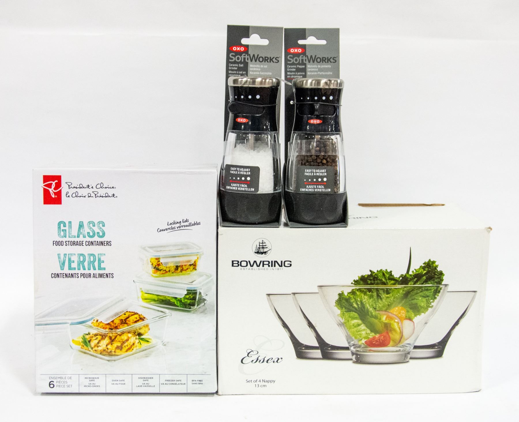 SALT & PEPPER GRINDER SET W/PC 6 PC GLASS FOOD STORAGE CONTAINERS & BOWRING 4 GLASS NAPPY BOWLS **ALL ITEMS MUST BE REMOVED BY 5PM SATURDAY, MARCH 25TH 2023. ALL REMAINING ITEMS WILL BE SUBJECT TO A $6.00 PER DAY STORAGE CHARGE. ANY ITEMS REMAINING AFTER MONDAY, APRIL 10TH, 2023 WILL BE CONSIDERED FORFEITED. NO REFUNDS WILL BE ISSUED FOR FORFEITED ITEMS. TO SCHEDULE A PICK UP APPOINTMENT CLICK HERE
