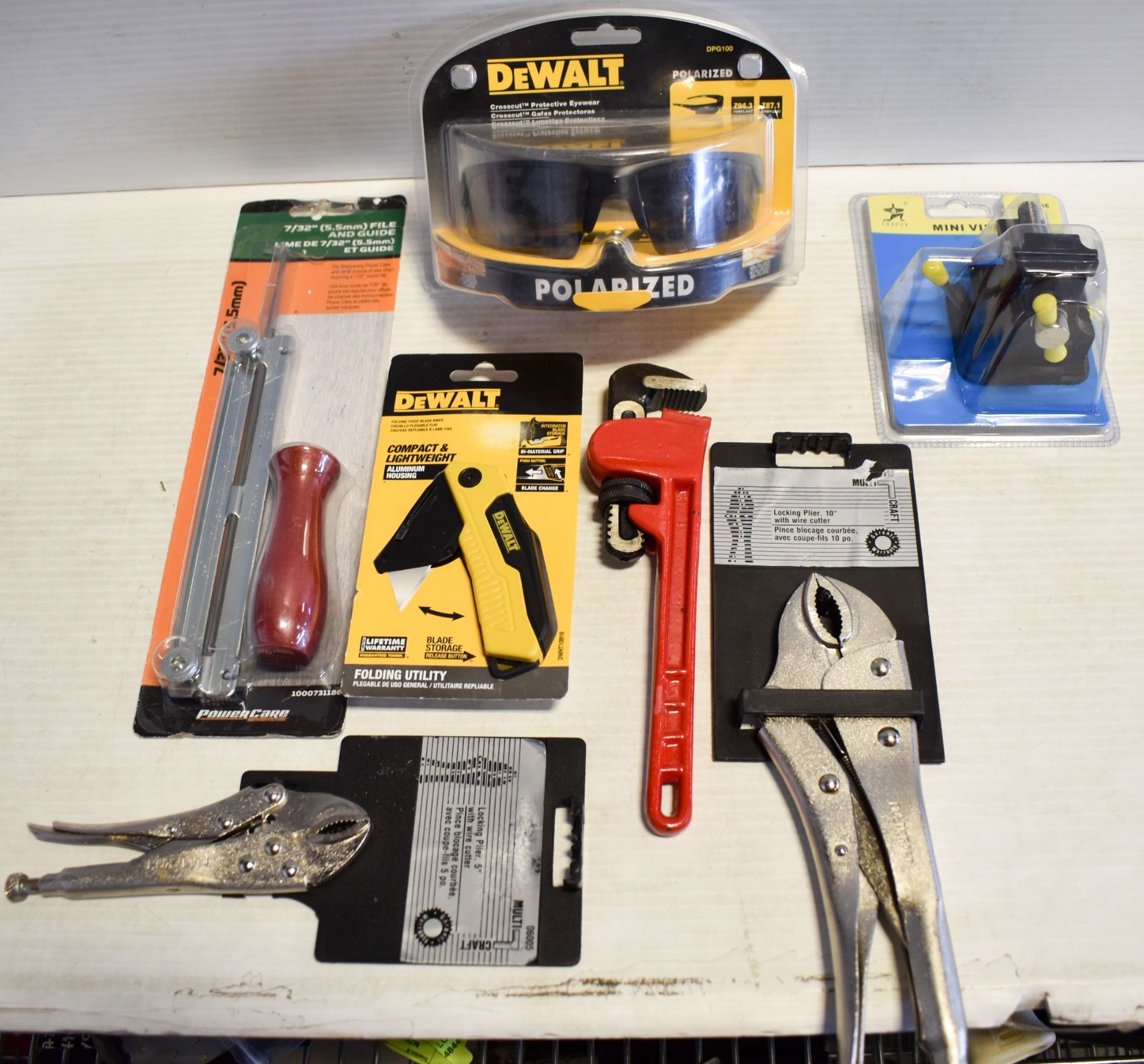 PLIERS WITH WIRE CUTTERS 5" & 10", PIPE WRENCH, MINI VICE, POWERCARE CHAIN SAW SHARPENER 7/33" FILE & GUIDE, DEWALT FOLDING UTILITY KNIFE & SAFTY GLASSES