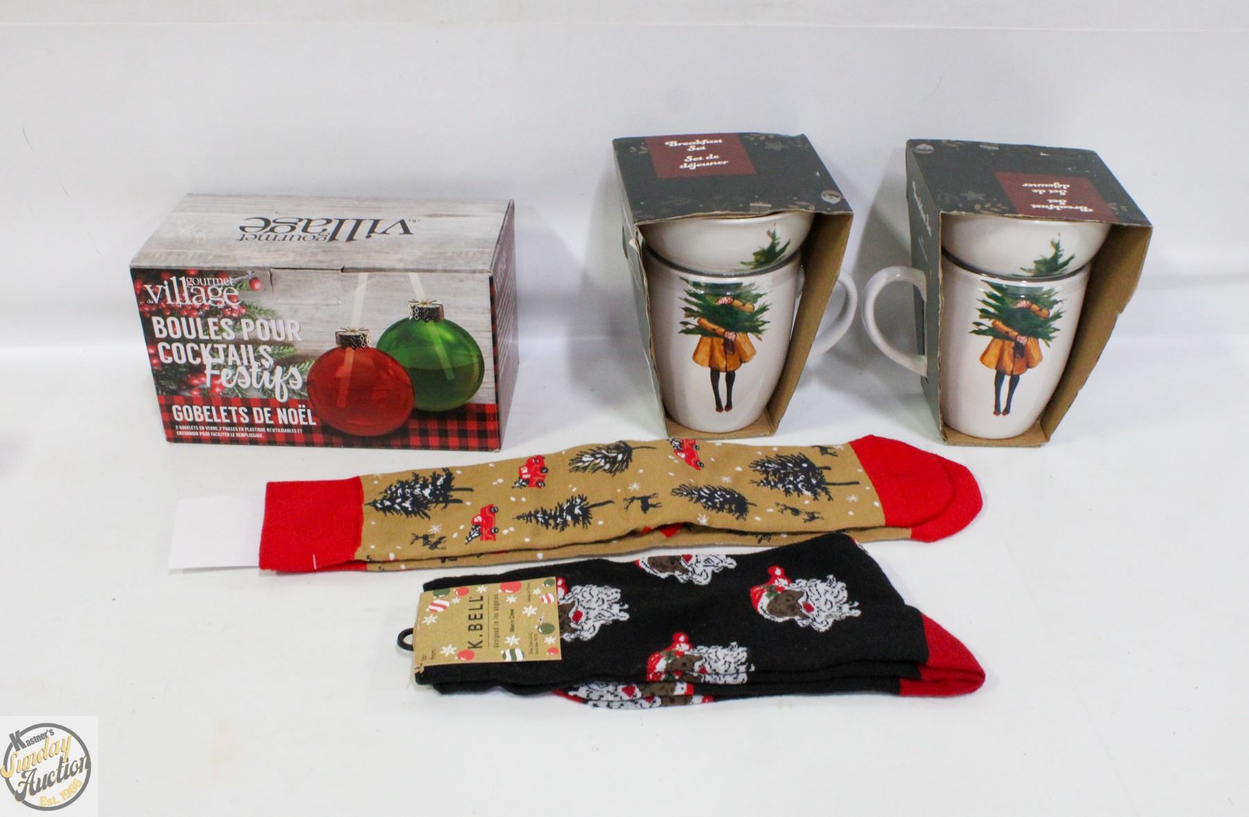 VILLAGE GOURMET PARTY SIPPER'S 2-PACK & 2-PAIR XMAS SOCKS **ALL ITEMS MUST BE REMOVED BY 5PM SATURDAY, NOVEMBER 22ND 2025. ALL REMAINING ITEMS WILL BE SUBJECT TO A $6.00 PER DAY STORAGE CHARGE. ANY ITEMS REMAINING AFTER MONDAY, DECEMBER 8TH 2025 WILL BE CONSIDERED FORFEITED. NO REFUNDS WILL BE ISSUED FOR FORFEITED ITEMS. TO SCHEDULE A PICK UP APPOINTMENT CLICK HERE