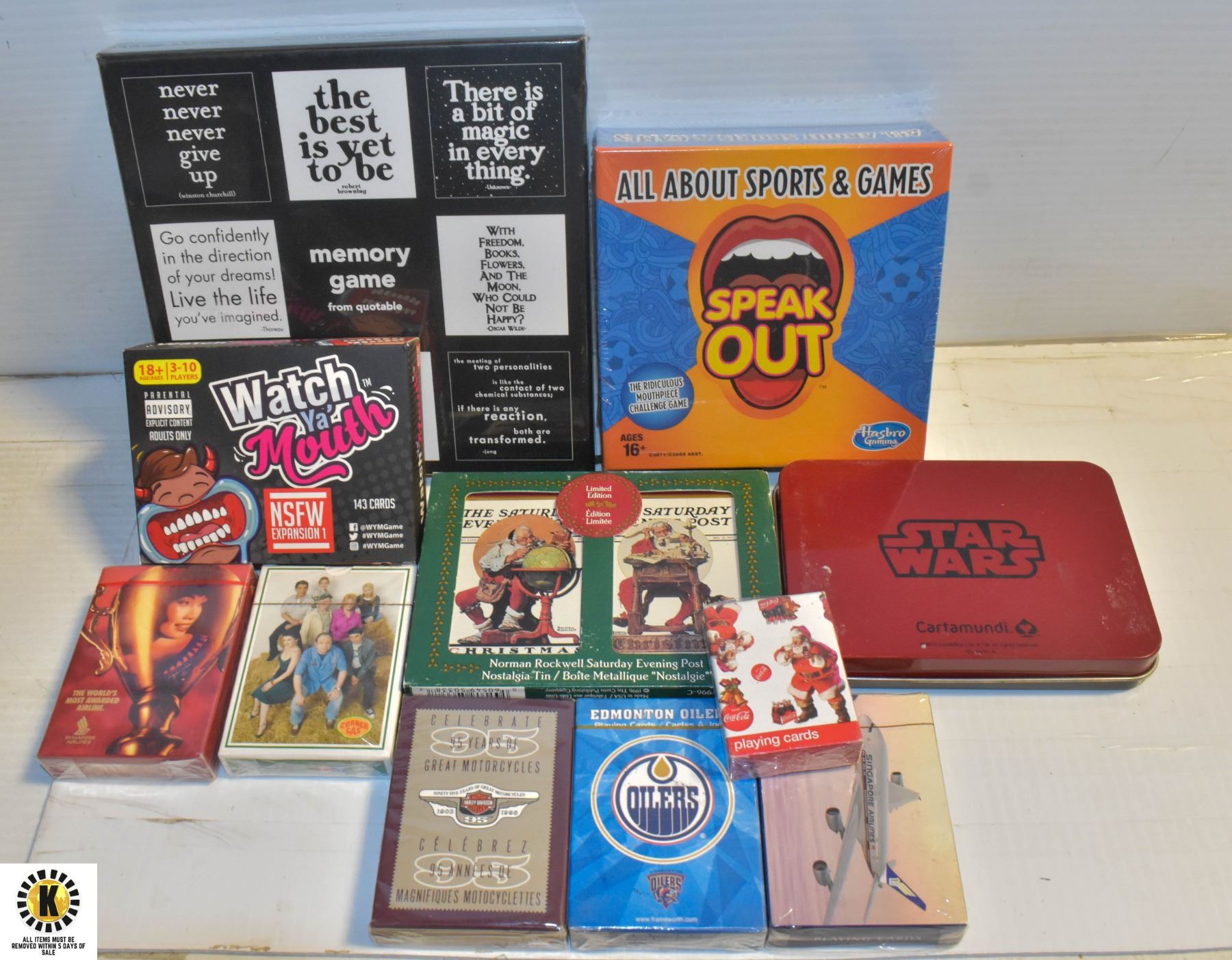 OILERS, HARLEY DAVIDSON, 2-PACK NORMAN ROCKWELL LIMITED EDITION, AIRLINES, COCA COLA, CORNER GAS W/SEALED (3) MINI GAMES NSFW WATCH YA MOUTH EXPANSION 1 & GAMING SPEAK OUT ALL ABOUT SPORTS & GAMES W/QUOTABLE MEMORY GAME